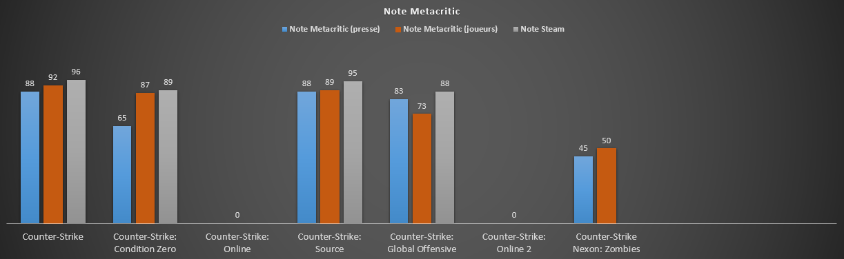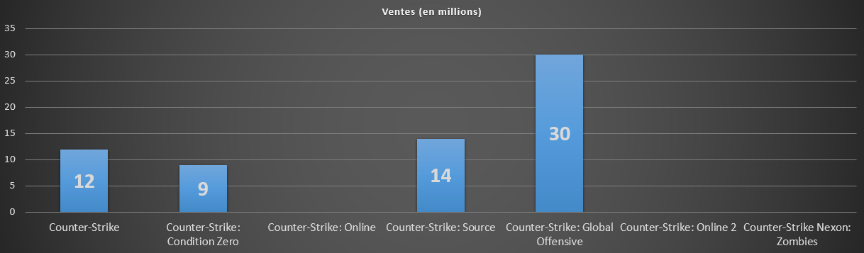 On peut recenser 7 titres majeurs pour la franchise Counter-Strike. Côté presse, la licence obtient une moyenne de 74 sur Metacritic. L’opus le mieux noté est Counter-Strike, à égalité avec Counter-Strike: Source. En bas du tableau, on retrouve le très bizarre Counter-Strike Nexon: Zombies avec 45. L’opus le mieux noté par les joueurs est CS premier du nom avec 92. La franchise s’est écoulée à plus de 60 millions d’exemplaires avec Counter-Strike: Global Offensive, qui en 2016 s’était vendu à plus de 25 millions d’exemplaires. Les autres opus n’ont pas à rougir avec 14 millions pour CS:S par exemple.
