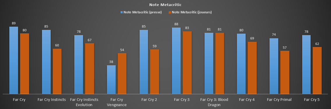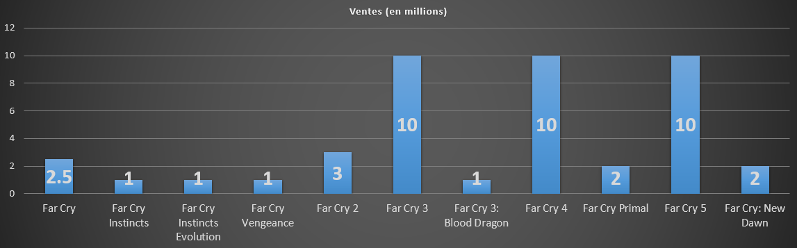 Sans compter DLCs et extensions, la franchise Far Cry regroupe 11 titres, dont seulement 8 sont sortis sur PC. En effet, on y retrouve deux exclusivités Xbox : Instincts et Instincts Evolution, et une exclusivité Wii : Vengeance. En moyenne, la licence a récolté une note de 77 sur Metacritic. En bas du tableau, Vengeance avec seulement 38, et la première place est détenue par le premier Far Cry avec 89. Les joueurs ne sont pas toujours d’accord avec la presse généraliste, en particulier sur les trois derniers opus ; Far Cry 4, Far Cry Primal et Far Cry 5 ont récolté respectivement 69, 57 et 62. Depuis Far Cry 2, la franchise s’est écoulée à plus de 50 millions d’exemplaires. Les plus gros cartons sont représentés par Far Cry 3, Far Cry 4 et Far Cry 5 qui se sont écoulés à plus de 10 millions d’exemplaires chacun. En bas du tableau, on retrouve sans surprise Primal et New Dawn. On sait par exemple que les ventes de New Dawn étaient 86 % inférieures à celles de Far Cry 5 lors de la première semaine. De plus, il aura fallu seulement 35 jours pour le retrouver à moitié prix.