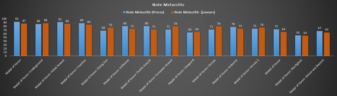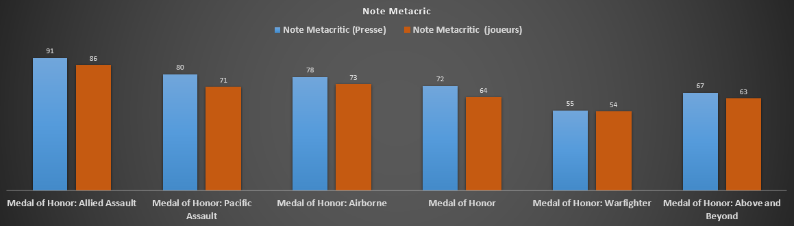 L’un des problèmes majeurs de la licence est sa diversité dans les plates-formes. On a eu droit à des titres exclusivement sur Gameboy Advance, d’autres sur PS2 et WII mais pas sur Xbox, d’autres sur consoles mais pas sur PC. Bref, un véritable bordel pour s’y retrouver. En moyenne, la franchise dans son ensemble récolte une note de 75 sur Metacritic. Le pire est toujours représenté par Warfighter, mais c’est le premier Medal of Honor, sorti en 1999, qui récolte la note la plus haute avec 92. Là encore, globalement l’avis des joueurs rejoint celui de la presse généraliste et on n’observe aucune déviation majeure. Bravo les Grands Journalistes !