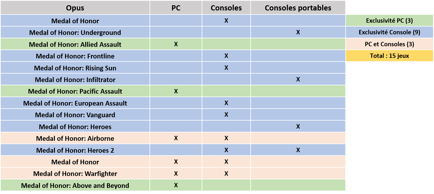 Avant d’écrire cet article, j’essayais de me remémorer les divers opus disponibles sur PC. Mais, en dehors d’Allied Assault (20/01/2002), de Medal of Honor (12/10/2010) et du dernier opus VR, Above and Beyond (10/12/2020) : j’étais bien incapable de me rappeler du reste. Finalement, j’étais pas si loin du compte. Car bien que la franchise Medal of Honor regroupe 15 jeux (+ 2 add-ons), seulement 6 sont sortis sur PC, sans compter les deux add-ons d’Allied Assault : Spearhead et Breakthrough. Sur ces 6 titres, seulement 3 étaient des exclusivités PC. Sur Metacritic, ils récoltent en moyenne une note de 74. La meilleure note (91) est attribuée à Medal of Honor: Allied Assault et la pire (55) à Medal of Honor: Warfighter. Les joueurs ont un avis similaire à la presse.