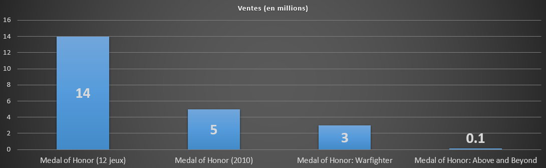 Côté ventes, je n’ai pas trouvé de chiffres pour les opus d’avant 2010. Par contre, le reboot de 2010 s’est écoulé à 5 millions d’exemplaires contre seulement 3 millions pour Warfighter. On est très loin des chiffres d’autres licences comme Battlefield ou Call of Duty. Et ce n’est pas le dernier titre – Above and Beyond – exclusivement VR qui risque de gonfler les résultats d’Electronic Arts. Selon IGN, en 2010, l’ensemble de la licence s’était écoulé à 14 millions de copies. Avec un gros doigt mouillé, on pourrait estimer que Medal of Honor dans son ensemble représente 25-30 millions de ventes. Pour vous donner une idée, cela équivaut généralement aux ventes d’un seul Call of Duty.