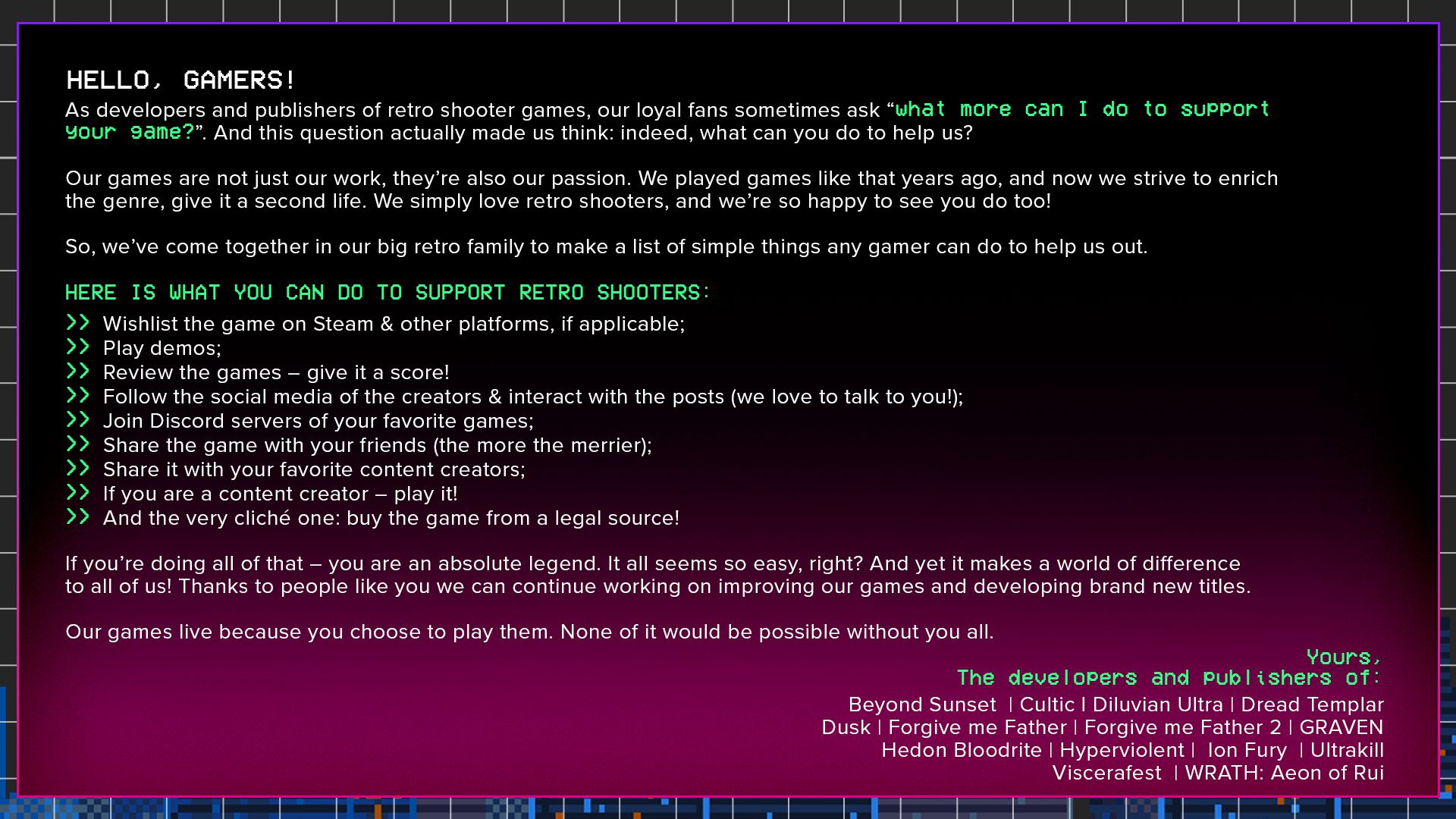 Si vous ne savez pas comment il faut prendre ce qui va suivre, ou sentez votre intellect insulté à la simple lecture du titre de notre news, sachez que l’initiative qu’une poignée de développeurs de rétro-FPS part d’un bon sentiment. En effet, ces derniers, par l’intermédiaire de Beyond Sunset, ont publié un billet de blog Steam, détaillant la bonne démarche à suivre pour soutenir vos jeux retro-FPS préférés.
