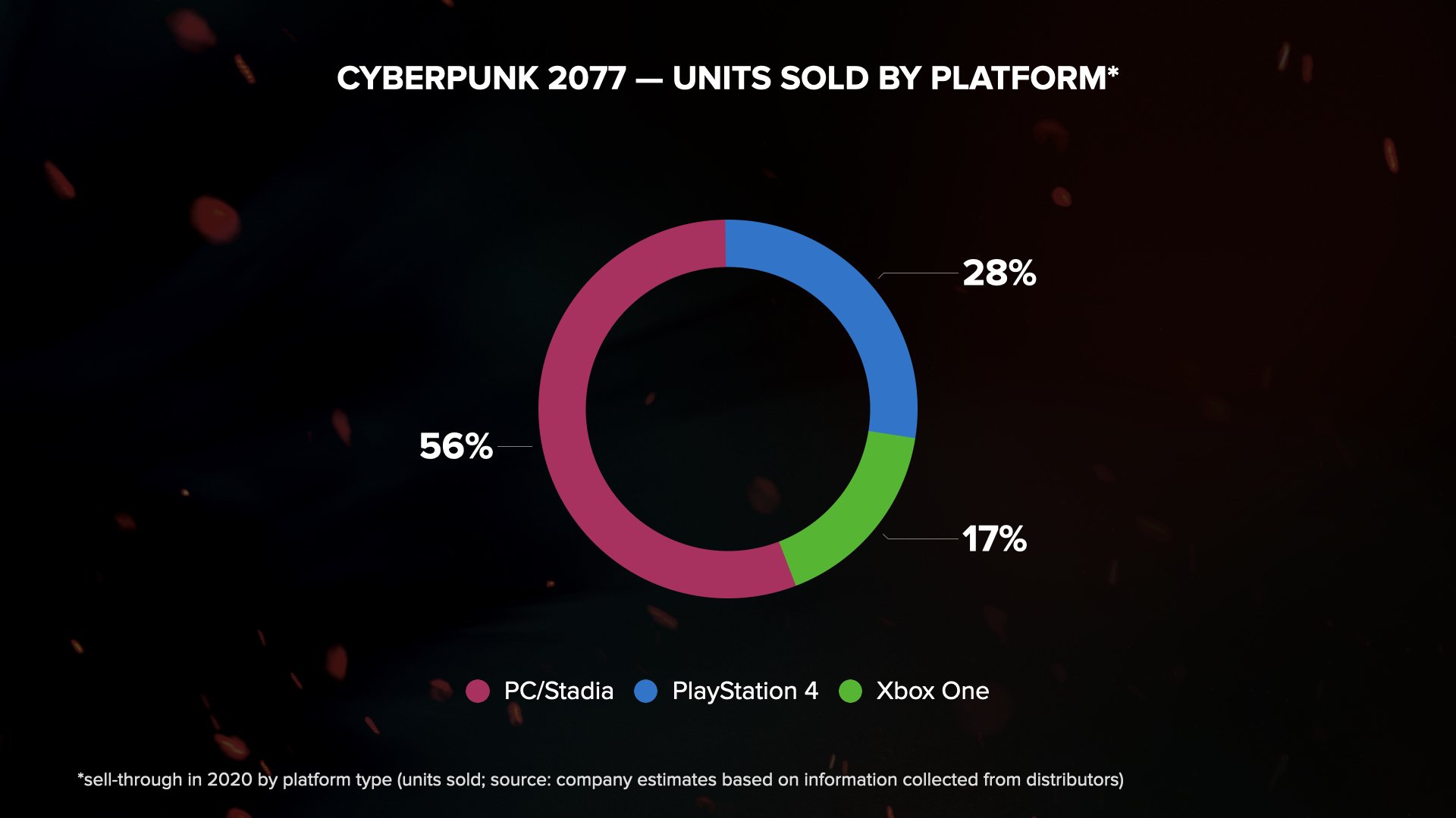 CD Projekt vient de dévoiler quelques chiffres pour Cyberpunk 2077. Le jeu s’est écoulé à 13.7 millions d’exemplaires en 2020. La majorité sur PC (56%) contre 28% sur PS4 et 17% sur Xbox One. 73 % des ventes étaient numériques. Rappelons tout de même que l’action de CD Projekt a perdu 55% de sa valeur depuis la sortie de Cyberpunk 2077. En effet, CP2077 s’est moins bien vendu que prévu. D’ailleurs, seulement 30 000 joueurs ont demandé un remboursement.