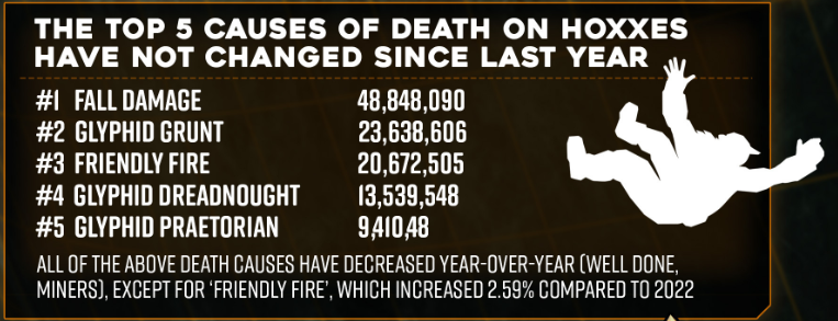 Sur des notes plus légères, il y a également des stats concernant le gameplay. Par exemple dans le top 3 des morts dans le jeu, on retrouve en troisième position, les tirs amis (visiblement, questionnez vous sur votre entourage avant de faire une coop). La deuxième cause de décès, ce sont les légendaires Glyphid Grunt (créatures dangereuses présentes sur la planète Hoxxes). Le top1 de ce classement aura peut-être eu raison des nerfs des plus rageux d’entre vous, ce sont les dégâts de chutes. À noter que le nombre de morts au cours des années aurait tendance à diminuer.