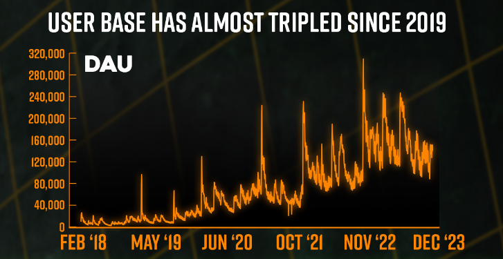 L’année 2023 a visiblement été une réussite pour Deep Rock Galactic puisqu’il comptabilise en tout 150 300 joueurs quotidiens, soit une augmentation 36 600 actifs journaliers comparé à 2022. De plus, l’équipe de Ghost Ship Games se réjouit du nombre d’utilisateurs qui a presque triplé depuis 2019. On peut cependant remarquer sur le graphique mis en avant sur Steam (disponible ci-dessous), que la courbe semble diminuer légèrement. Il sera donc intéressant de comparer avec les chiffres cette année.