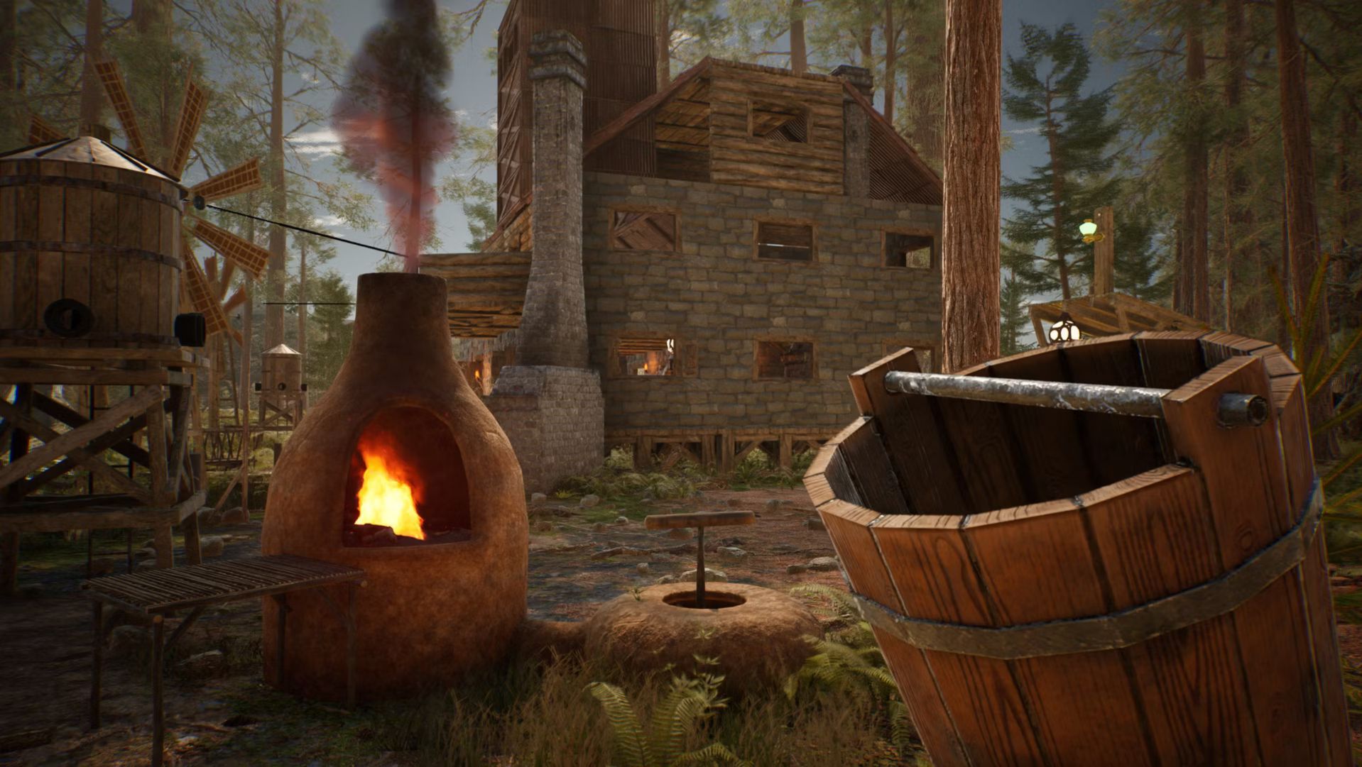 Quant au système de crafting, il est question d’interface diégétique à l’exemple de l’inventaire et du craft de The Forest. Il ne se résumera pas simplement à une combinaison d’éléments, car le joueur devra de réaliser les différentes étapes de fabrication d’un objet à partir de la forge. Par ailleurs, le développeur tient particulièrement à mettre en avant l’une des mécaniques innovantes qu’est le système de déplacement des bûches via un système de canaux, vu auparavant dans des vidéos gameplay, car ce processus automatisé apporte de la profondeur dans la construction de la base et du craft.