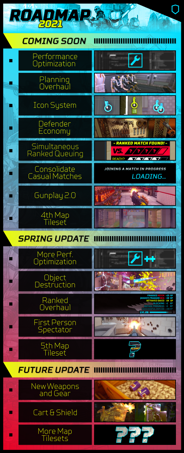 En difficulté depuis sa sortie en accès anticipé, puisqu’il rassemble difficilement une centaine de joueurs, Due Process vient de publier sa feuille de route pour les mois à venir. Comme vous pouvez le découvrir ci-dessous, les prochaines semaines apporteront une refonte de l’économie des défenseurs, une modification du gunplay ou encore de nouveaux environnements pour les cartes. Au printemps : de l’optimisation et un système de destruction des objets. Puis, à plus long terme, de nouvelles armes et encore plus de cartes. Malheureusement, rien ne semble concerner ce problème de rythme que l’on pointait dans notre preview. Notez qu’à l’occasion des soldes Steam, le jeu est à -50 %.