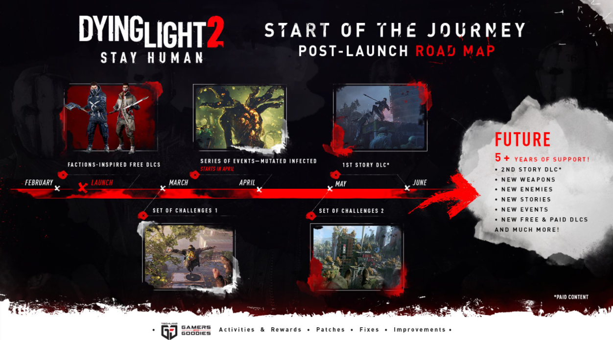 À quelques jours de sa sortie, le 4 février prochain, Dying Light 2 vient de publier sa feuille de route sur son compte Twitter. Des challenges seront disponibles dès le mois de mars, puis plusieurs évènements temporaires en avril. Il faudra attendre le mois de juin pour le premier DLC payant qui apportera du contenu supplémentaire côté histoire. Rappelons que les développeurs ont promis plus de 5 ans de mises à jour : armes, évènements, ennemies… Bref, un suivi à l’image du premier opus.