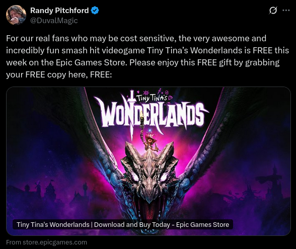 Au-delà de la publicité mensongère sur le caractère « génial » et « incroyablement fun » de Tiny Tina’s Wonderlands, NoFrag l’a déjà démontré ici, on admirera la détermination de ce cher Randy — CEO de Gearbox, on le rappelle — a nous dégoûter toujours un peu plus de sa personne à chacune de ses interventions. Sinon, oui, vous pouvez récupérer son jeu douteux GRATUITEMENT, soyez-en assurés, sur l’EGS pour profiter d’un gameplay bien mou, et d’un humour fort gras. À l’image de M. Pitchford en fait.