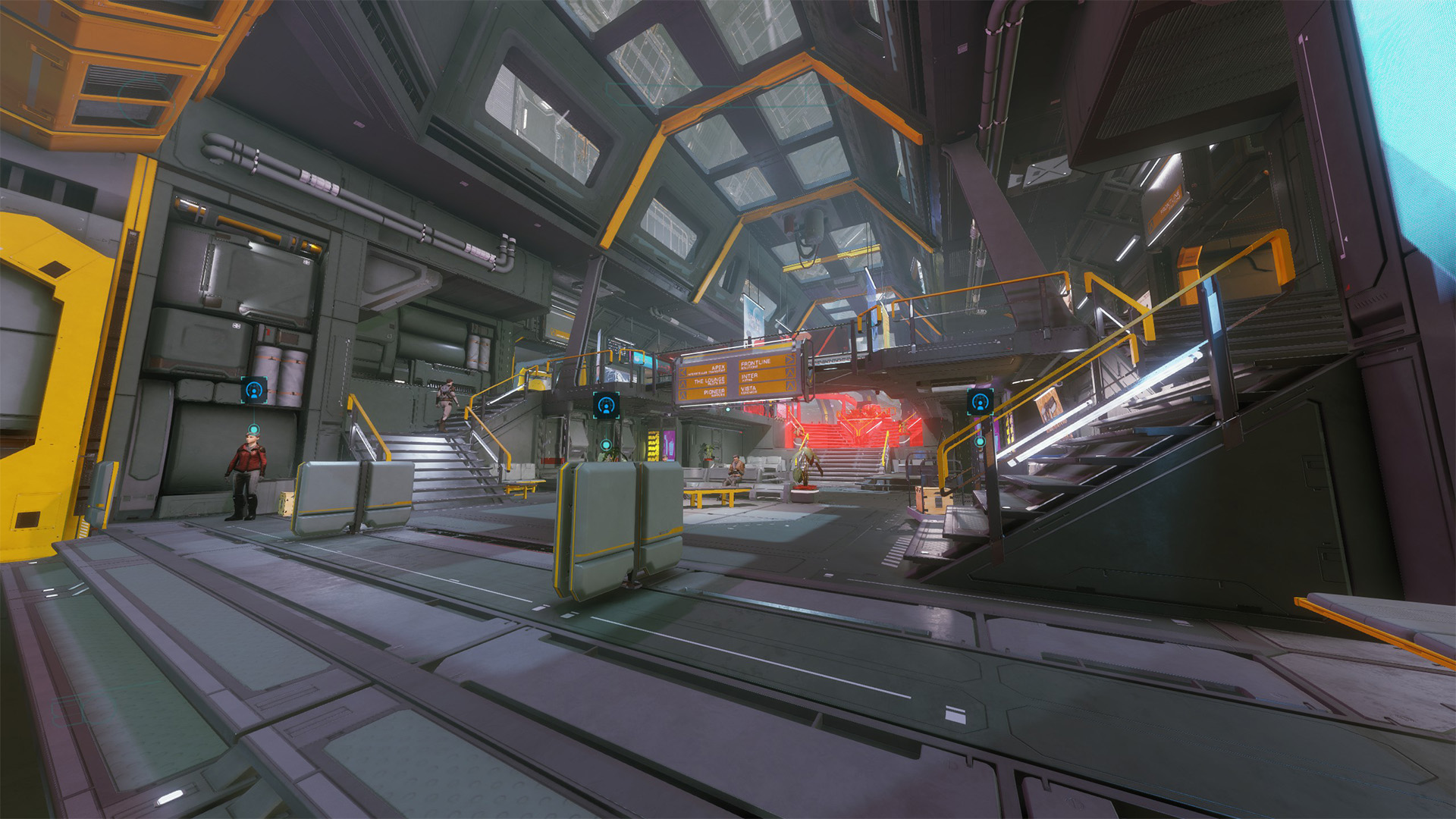 L’alpha d’Elite Dangerous: Odyssey se découpera en quatre phases distinctes qui apporteront chacune de nouvelles fonctionnalités. À noter également que cette alpha se déroule en parallèle de la progression normale du joueur. Tout ce qui s’y passe n’a aucun impact sur votre carrière dans la branche normale du jeu. Actuellement, nous en sommes à la phase deux de l’apha, qui fait suite à une première session plutôt limitée en contenu. Le joueur commence par déambuler dans une station spatiale qui sert de hub. Vous y croisez d’autres joueurs mais aussi des PNJs pour faire des achats ou choisir des missions. L’optimisation semble tout à fait correcte et si les intérieurs ne sont pas exceptionnels, c’est loin d’être repoussant. En tout cas, ça tourne relativement bien, malgré quelques chutes de framerate inexpliquées par moment sur une configuration à base de i9-9900K, 32Go de RAM et une RTX 2080ti en 1440p. Une fois que vous avez trouvé votre mission, vous allez pouvoir ressortir votre Nintendo Switch ou un bouquin, car les trajets sont terriblement longs et chiants. Bien sûr, c’est déjà le cas dans le jeu de base et on imagine mal les développeurs revoir entièrement un des fondements de leur jeu. Mais voilà, sachez qu’une grande partie de l’expérience Elite Dangerous se résume à naviguer dans le vide pendant plusieurs dizaines de minutes pour aller d’une planète à une autre ou d’un système à un autre.