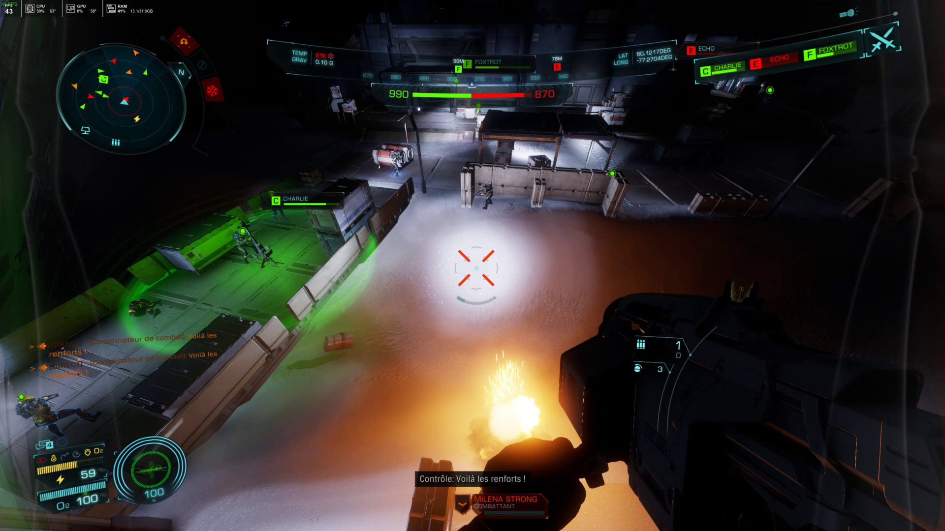 Ci-dessous, 30 minutes de gameplay sur une mission type « Raid contre une installation, éliminer les charognards de feng » lors de la phase 2 de l’alpha d’Elite Dangerous: Odyssey :