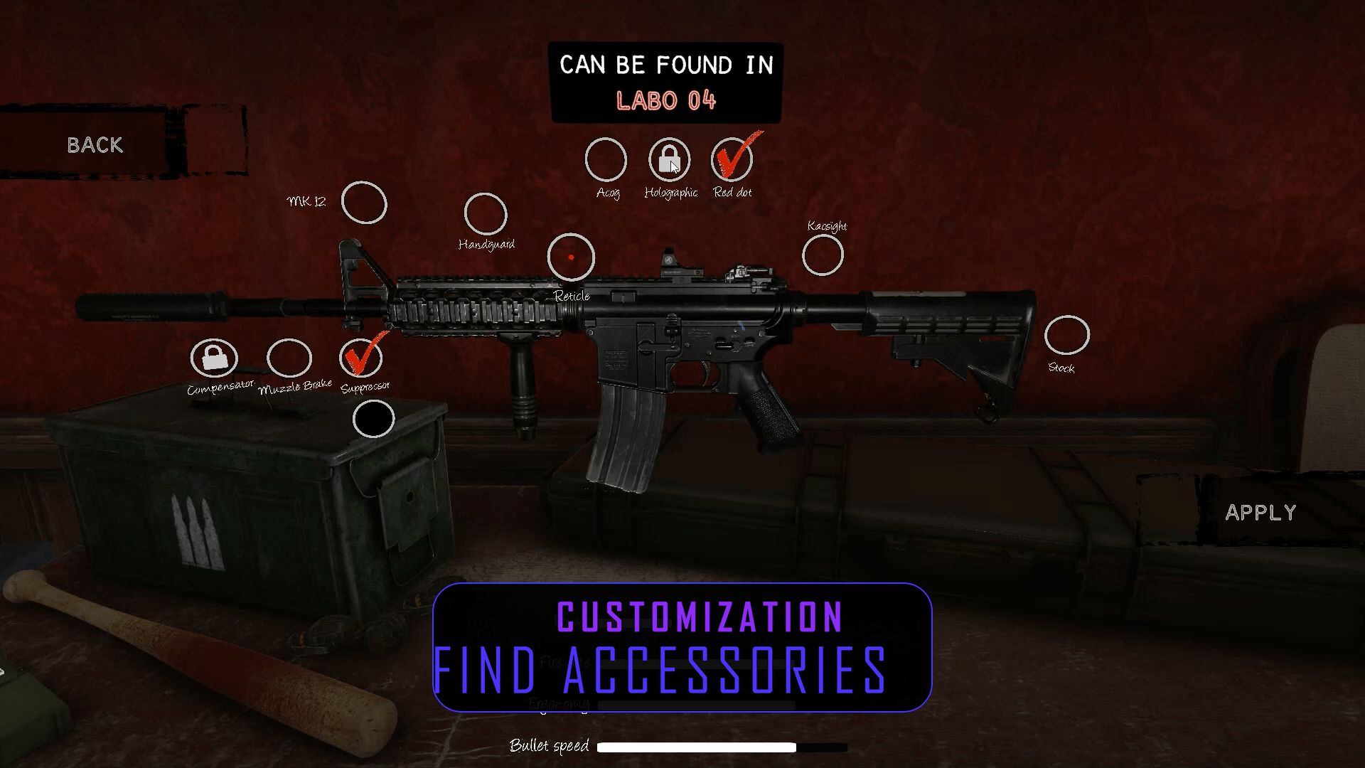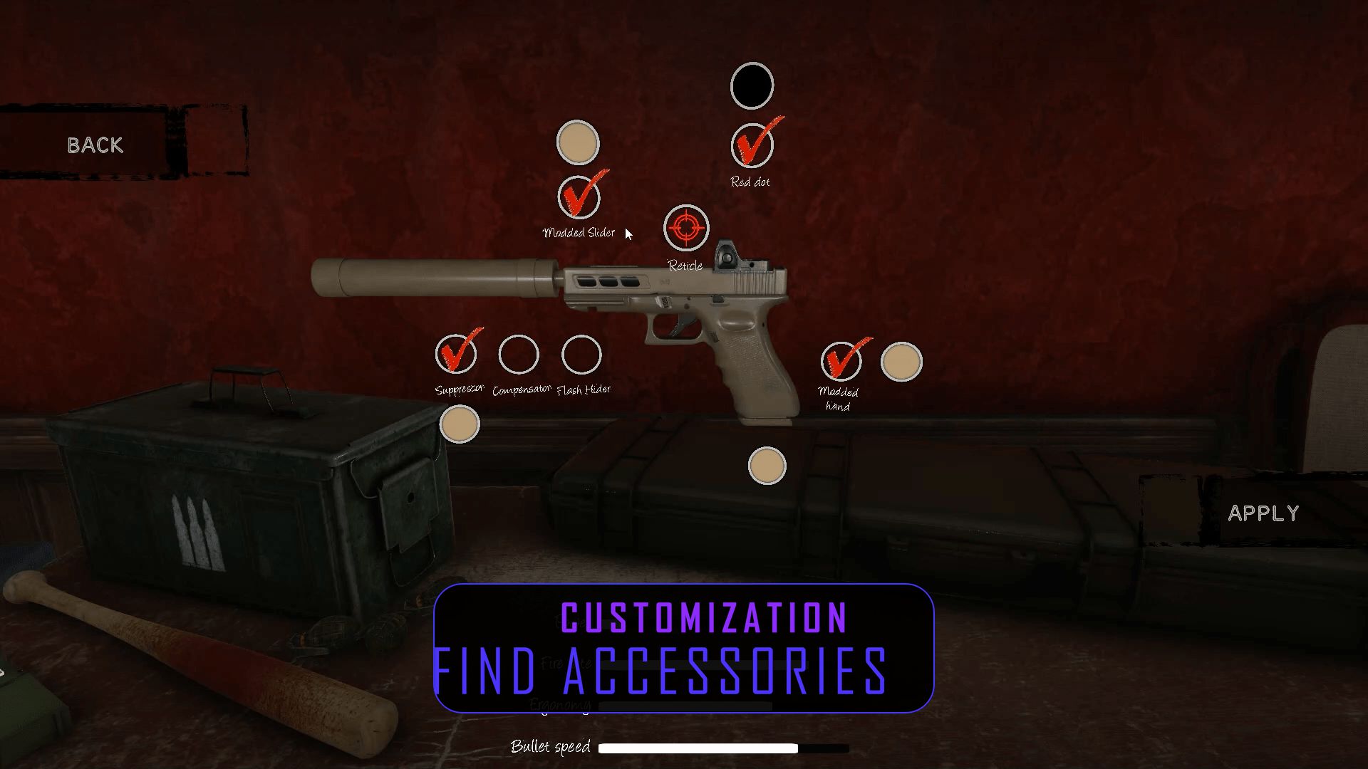 Pour finir, j’ai interrogé Julien sur l’intérêt d’avoir certains éléments tels que des silencieux pour un jeu de ce type, et il m’a expliqué que c’était uniquement cosmétique – hormis un viseur ou deux. Comme il aime bien le principe de customiser son arme, avec notamment des viseurs, des cache-flamme ou autres, et trouvait ça intéressant de l’ajouter, en cachant les accessoires derrière de petites interaction à gauche et à droite. D’ailleurs, il est possible de savoir quel niveau recèle tel ou tel élément lorsqu’on est dans le menu.