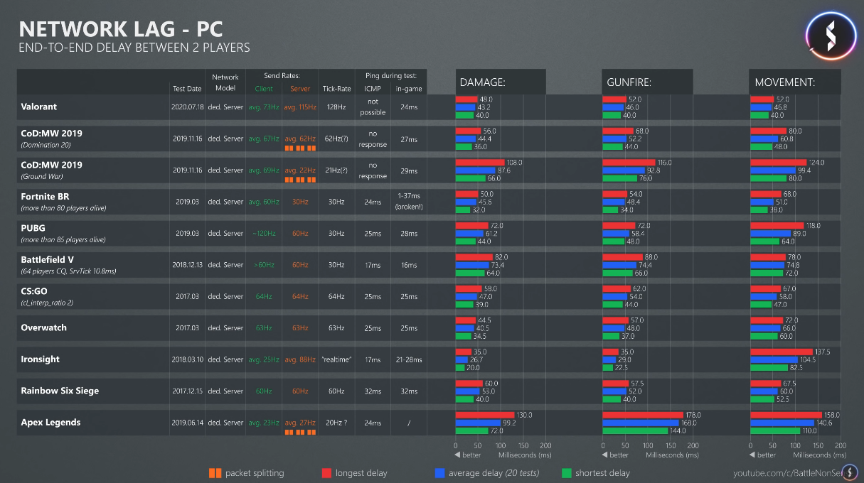 L’excellente chaîne Youtube Battlenonsense vient de publier une nouvelle vidéo d’analyse consacrée au netcode de Valorant, le nouveau FPS de Riot Games. Avec ses serveurs au tickrate de 128, Valorant faisait de son netcode un outil de promotion pour séduire les joueurs. Un tickrate plus proche de 115, en moyenne, côté serveurs selon les mesures de Battlenonsense. Pour le reste, les résultats sur le network delay sont très bons, aussi bien pour les dégâts, le tir ou les mouvements. Petit bémol côté lag compensation puisqu’un adversaire avec un ping important pourra toujours vous toucher même si vous êtes déjà derrière un mur. Bref, globalement, le netcode de Valorant est bon.
