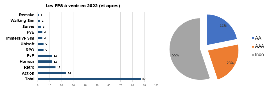 La liste dressée en préparant cet article comprenait pas moins de 170 FPS divers et variés. Impossible de tous les noter : non seulement ç’aurait été long pour nous, mais ç’aurait été tout à fait indigeste pour vous. Nous avons donc fait un tri parmi les plus grosses sorties des prochaines années pour vous donner une idée de ce qui attend les fans de FPS en 2022 et après. Dans cette sélection, on retrouve 87 jeux qui se décomposent ainsi :