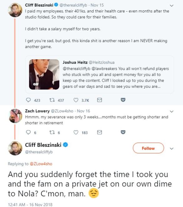 Le drame s’est une nouvelle fois noué sur les réseaux sociaux. Un gamer déçu de ne pas pouvoir profiter du jeu qu’il avait payé a interpellé Cliff pour lui réclamer un remboursement. Toujours très franc, le papa de Gears of War n’a pas hésité à préciser qu’il ne s’était pas versé un salaire depuis 2 ans et qu’il avait assumé ses responsabilités en payant les salaires et assurances maladie de ses employés, et cela même plusieurs mois après la fin du studio.