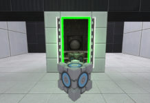 S’il y a bien sur une chose que Portal Reloaded se démarque, c’est sur la présence d’un troisième portail. Celui-ci, vert et rectangulaire, permet de voyager dans le temps. En le traversant depuis le présent, on atterrit 20 ans plus tard au même endroit. Comme pour les autres portails, on conserve sa vitesse en passant dedans. Si l’on pose des portails dans le présent ou que l’on place un cube quelque part, ils seront présents dans le futur, mais dans cet espace-temps, on peut les replacer, et même rapporter le cube de l’autre côté. Ça a l’air un peu compliqué comme ça, et au début, ça l’est vraiment ! Heureusement, les premiers puzzles sont très basiques pour nous faire comprendre les règles pas du tout intuitives, mais pourtant bien cohérentes avec le postulat de départ. Tout est d’une logique implacable.