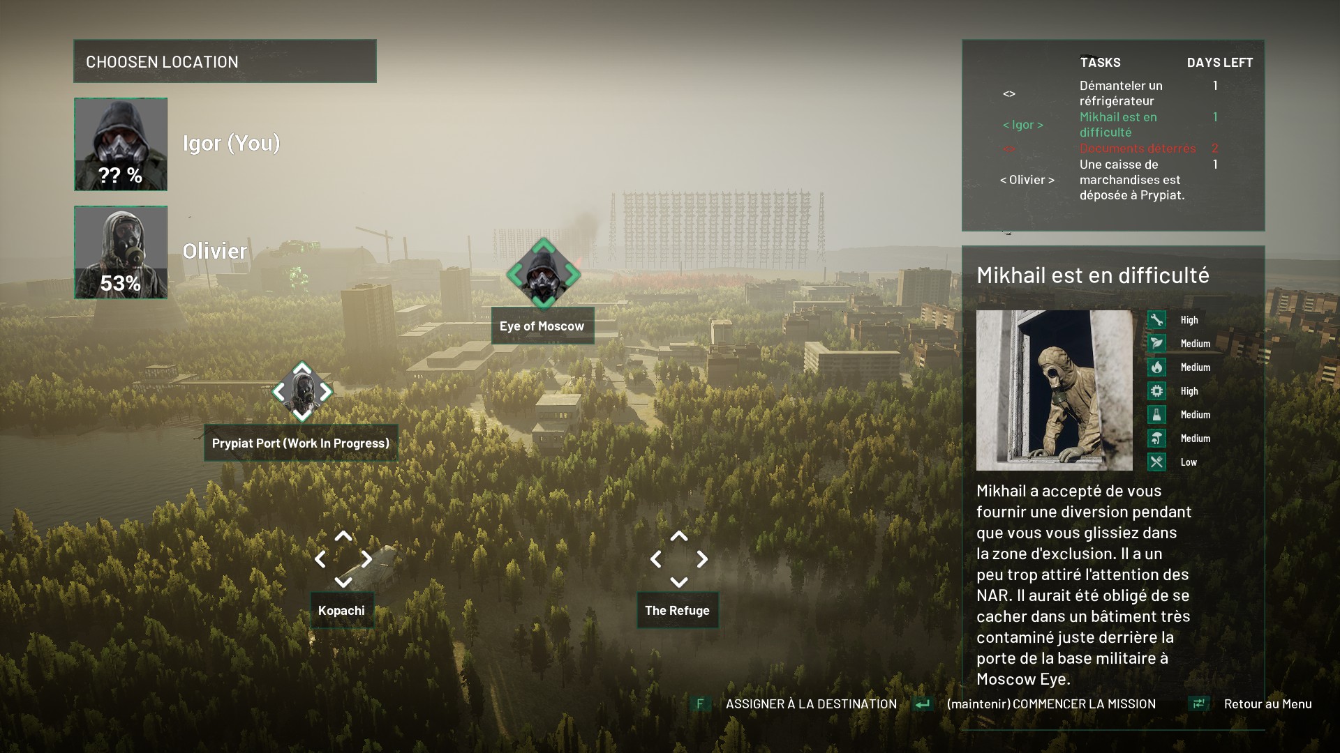 Après une introduction scriptée posant les bases du scénario, le joueur se trouve donc dans le Refuge. Celui-ci sert en réalité de hub : on peut y construire sa base d’opération à travers un système similaire à celui de Fallout 4, dialoguer avec ses compagnons d’armes et recevoir des quêtes via une radio, fabriquer du matériel, suivre l’avancement de l’investigation mais aussi sélectionner sa prochaine expédition via une vue aérienne de la Zone. Pour le moment, seuls 4 niveaux sont explorables et exploitables. L’aventure est sectionnée en jours, une expédition représentant une journée – certaines missions ont un temps limité pour être accomplies et il faut parfois faire des choix ou envoyer vos coéquipiers les remplir à votre place (avec plus ou moins de succès). Il existe deux types de missions : celles à objectifs scénarisés et celles, dites d’exploration, dans lesquelles vous visitez librement une zone à la recherche de ressources ou d’une rencontre fortuite. Une fois en jeu, vous vous retrouvez sur une carte de taille moyenne que vous pouvez arpenter comme bon vous semble – dans les limites imposées par les zones radioactives et les éléments de décors, évidemment.