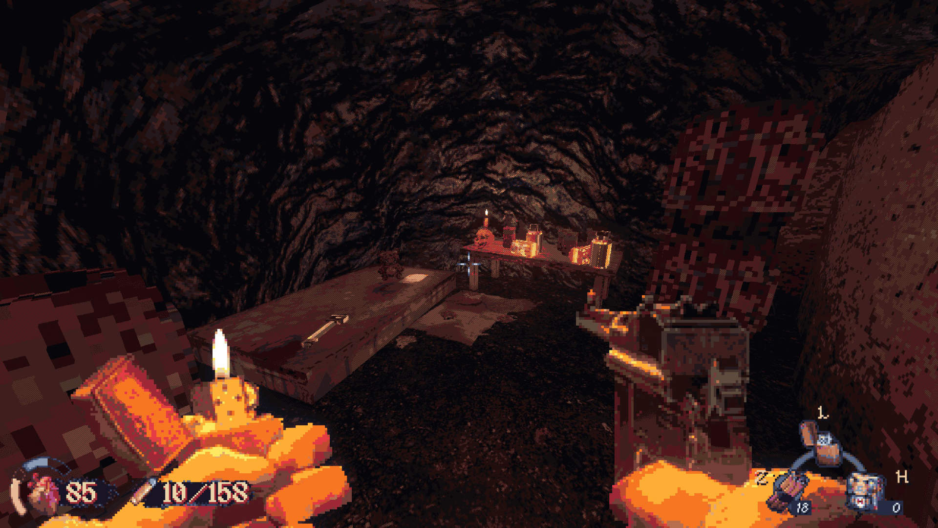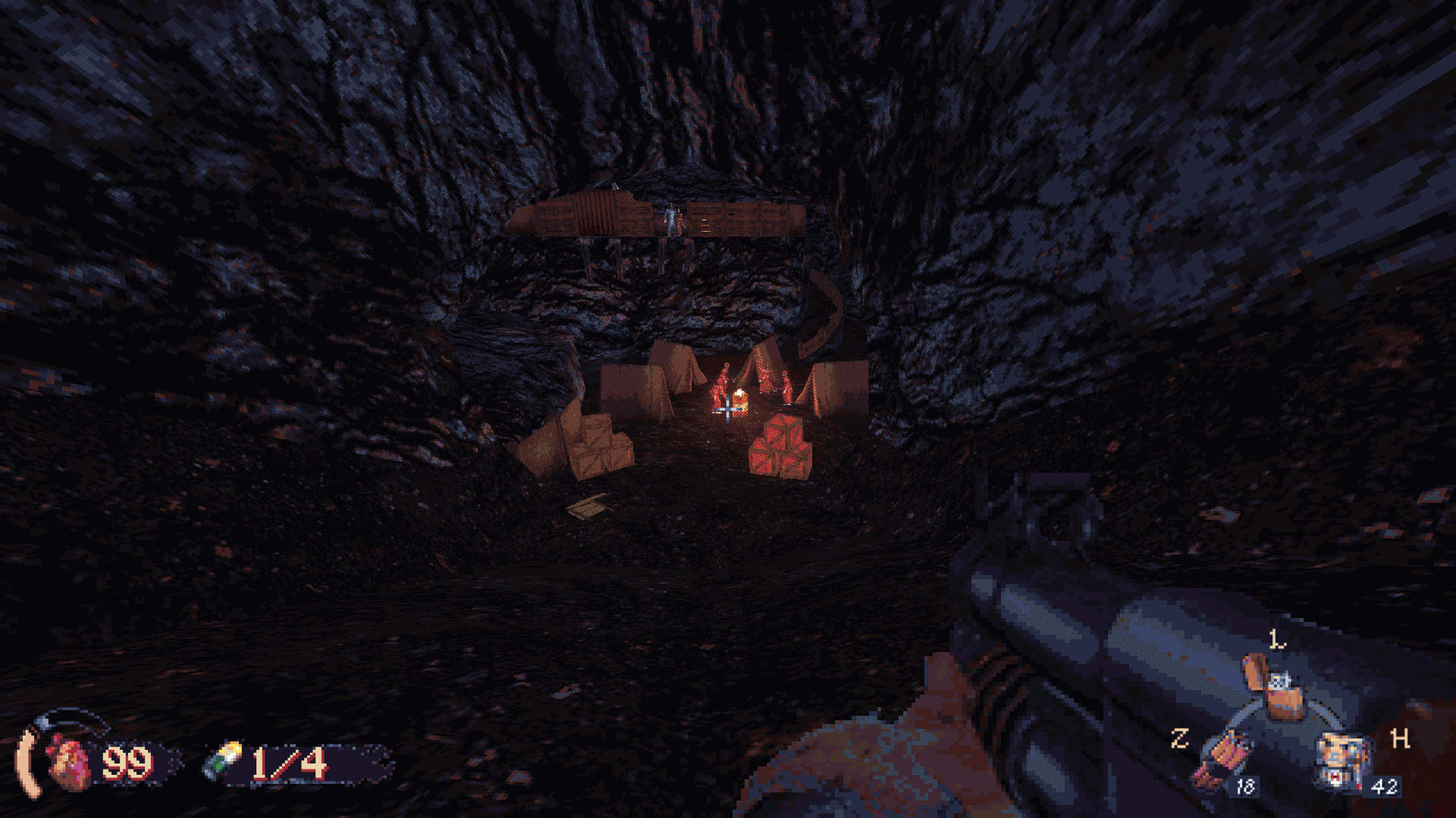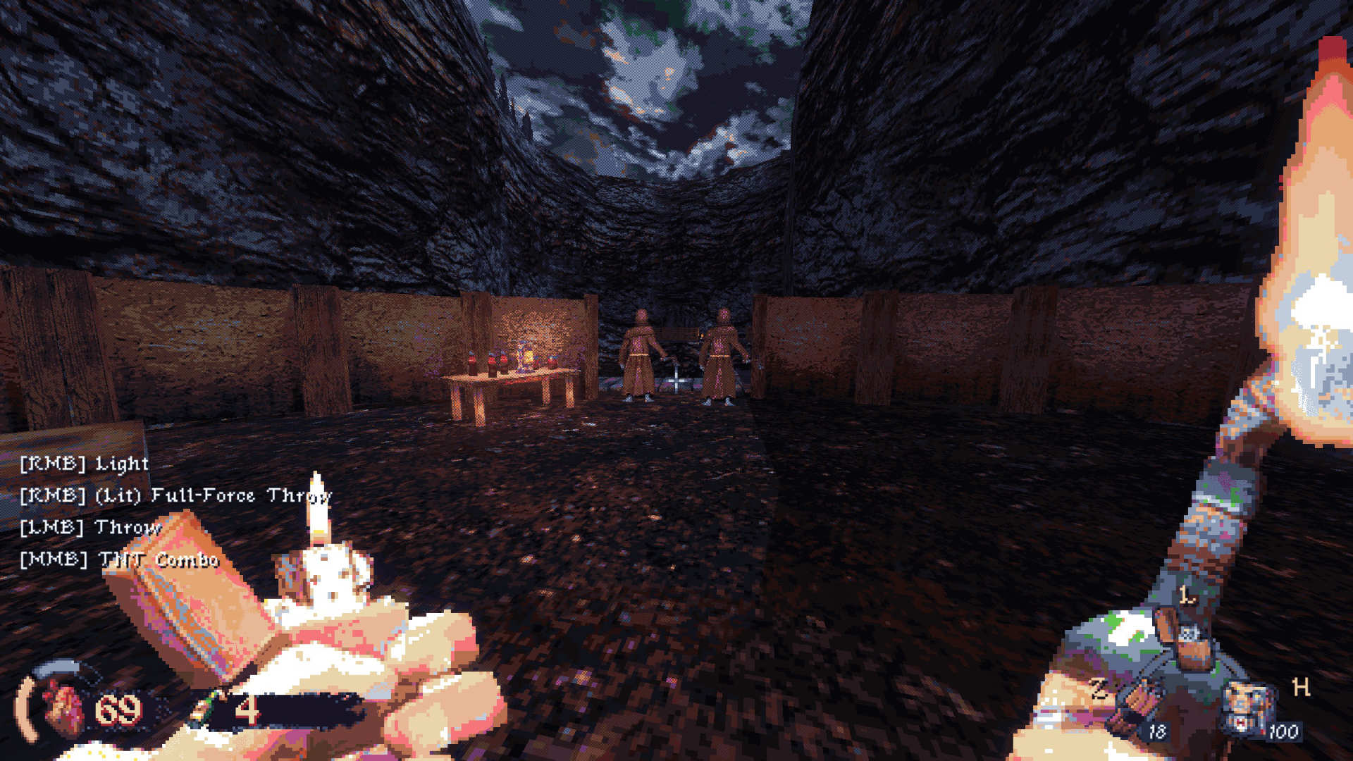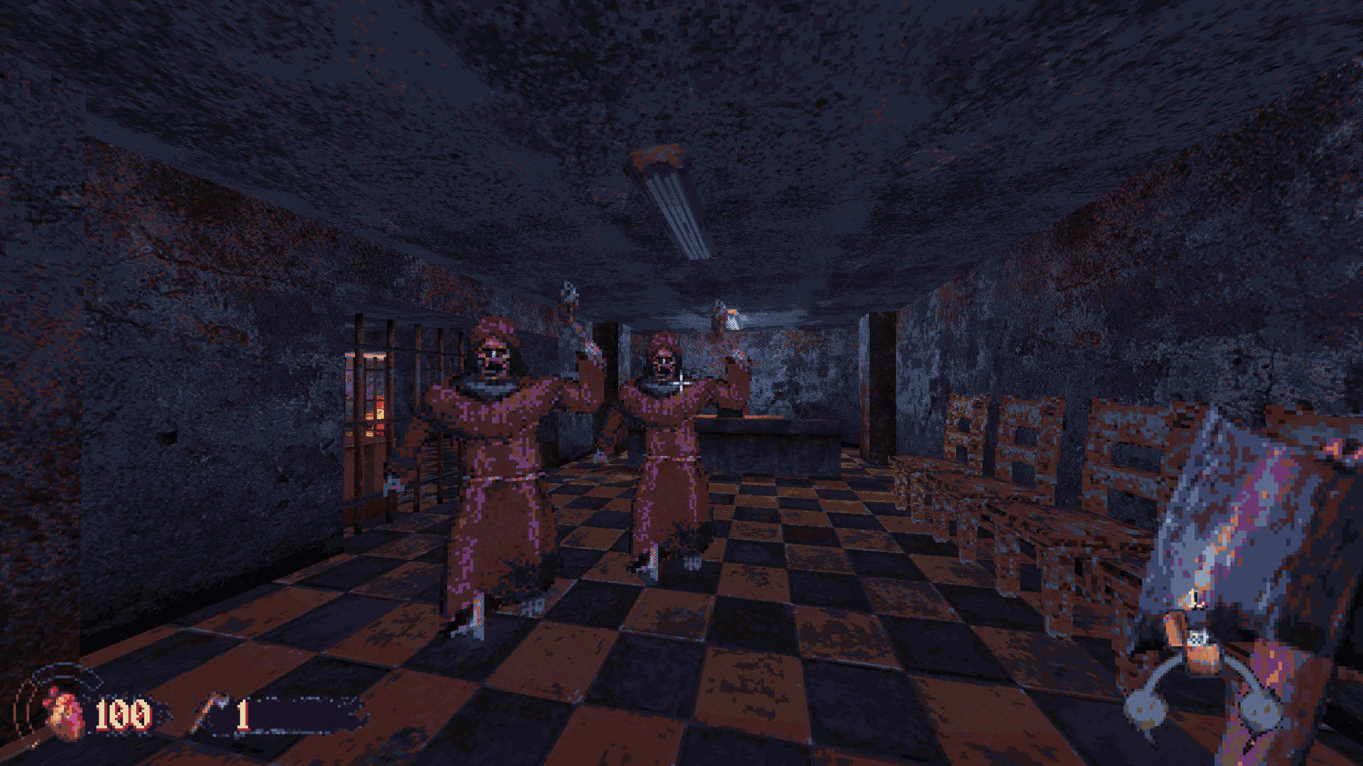 En effet, si les ennemis sont bien des sprites 2D à l’ancienne, certains objets du décor sont en 3D, interactifs et soumis à physique. Il est tout à fait possible de se prendre un instant pour John Cena, et de balancer des chaises à la face des cultistes, ou encore de se servir de lanternes comme cocktails Molotovs. Et bien entendu, si utiliser l’environnement n’est pas votre truc, les pétoires de CULTIC ne sont pas en reste. L’arsenal est relativement classique et assez limité – comptez six armes en excluant les projectiles, mais il est particulièrement plaisant à utiliser. Même l’arme de poing de base, un merveilleux Mauser C96, offre de bonnes sensations, particulièrement quand un joli headshot déclenche une fontaine de fluides corporels accompagnée d’un petit moment de slow motion bien utile. Et cerise sur le gâteau, un système d’amélioration permet de modifier ses jouets, afin d’augmenter la taille de leurs chargeurs, leurs dégâts, etc.