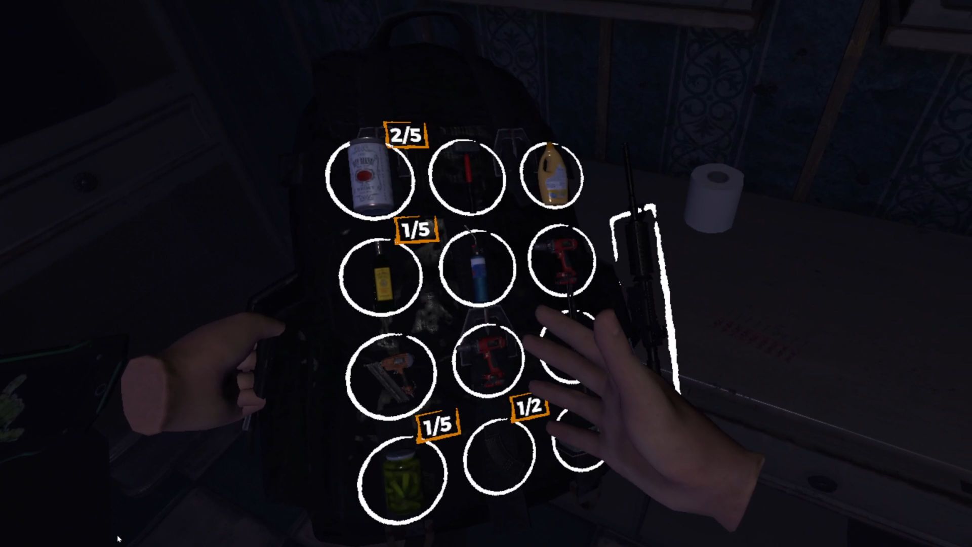 L’un des aspects principaux de Requisition VR est le loot : sur la carte, il y a un ou deux bâtiments que vous devez explorer pour récupérer des objets. Mais le réalisme ne semble pas spécialement au cœur des préoccupations des développeurs. En effet, il ne sera pas rare de trouver une kalashnikov dans le petit tiroir de la salle de bain, à côté d’une conserve de haricots rouges. Et que dire de cette énorme imprimante rangée dans un placard de la cuisine ? Visuellement, ils sont dans de petits emplacements, réduisant leur taille pour rentrer à cet endroit, mais à peine saisis, ils reprennent leur taille normale, se bloquant parfois à travers les meubles ou le sol, nous empêchant de les récupérer. De la même manière, mais cette fois-ci sans bug, n’importe quel objet, quel que soit son volume, peut-être rangé dans son sac à dos, et il ne prendra qu’un seul emplacement. On ne va certainement pas s’en plaindre, c’est, pour le coup, plutôt pratique. Ce qui ne l’est pas, c’est la difficulté pour attraper ou replacer ses armes dans les accès rapides devant soi. Cela fait office de holster ou de fourreau, mais c’est un calvaire à utiliser, même quand il n’y a pas d’urgence. Alors dans le feu de l’action, avec un zombie qui tente de vous manger l’oreille, vous aurez tôt fait de ramasser n’importe quelle merde qui traîne à côté plutôt que votre fidèle masse à deux mains.