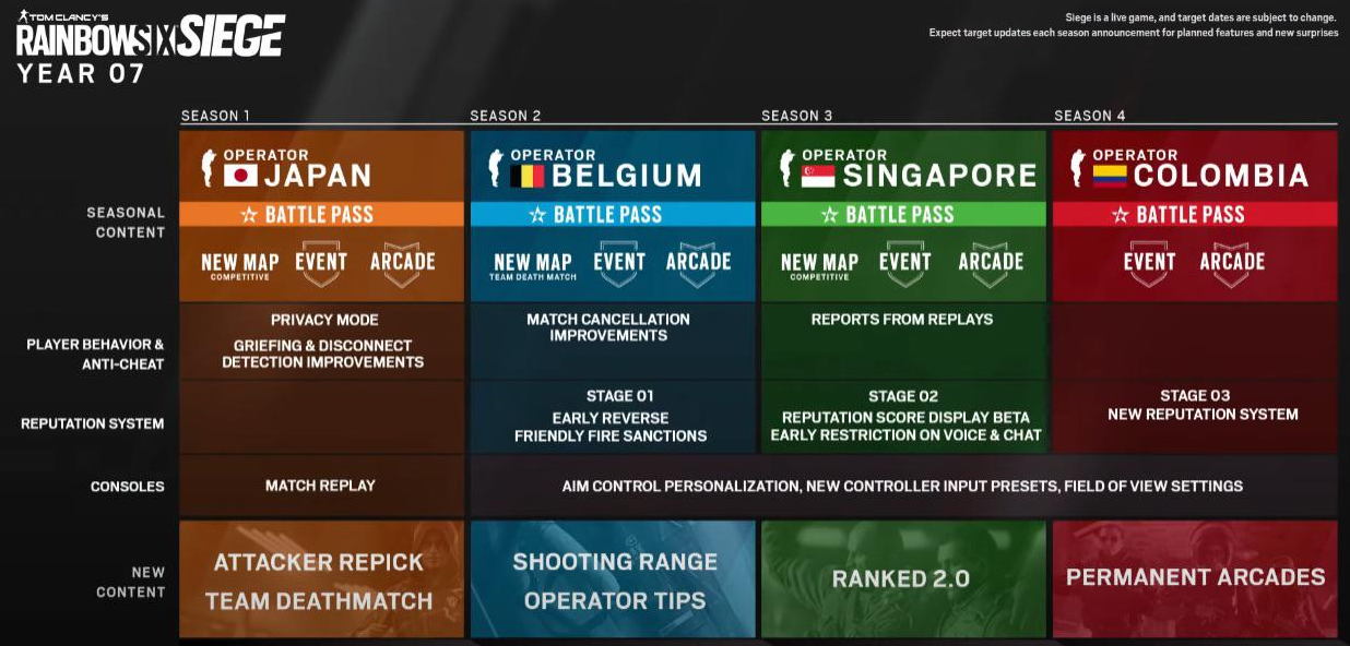 Plus globalement, au cours de cette année, Rainbow Six Siege promet la mise en place d’un stand de tir, du « ranked 2.0 » et une playlist arcade permanente. Sous le terme « ranked 2.0 » se cache une refonte du système de progression : tous les joueurs débuteront au rang copper pour ensuite progresser au lieu de se faire attribuer un rang après plusieurs matchs de placement. Enfin, les joueurs consoles pourront bénéficier du cross-play (PS/Xbox) à la fin de l’année.