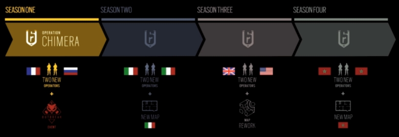 Le déroulement des différentes saisons n’a plus de secret pour qui que ce soit : une mise à jour majeure par trimestre, amenant chacune deux nouveaux opérateurs et un autre ajout important, qu’il s’agisse d’une map, d’un nouveau mode de jeu ou d’une énième amélioration de l’aspect technique du jeu. On trouvera du côté des opérateurs un français, des italiens, un russe, un anglais, un américain et trois opérateurs marocains pour terminer l’année. Les saisons 2 et 4 de cette nouvelle année introduiront deux nouvelles cartes, alors que la troisième sera dédiée à la refonte de certaines maps existantes.