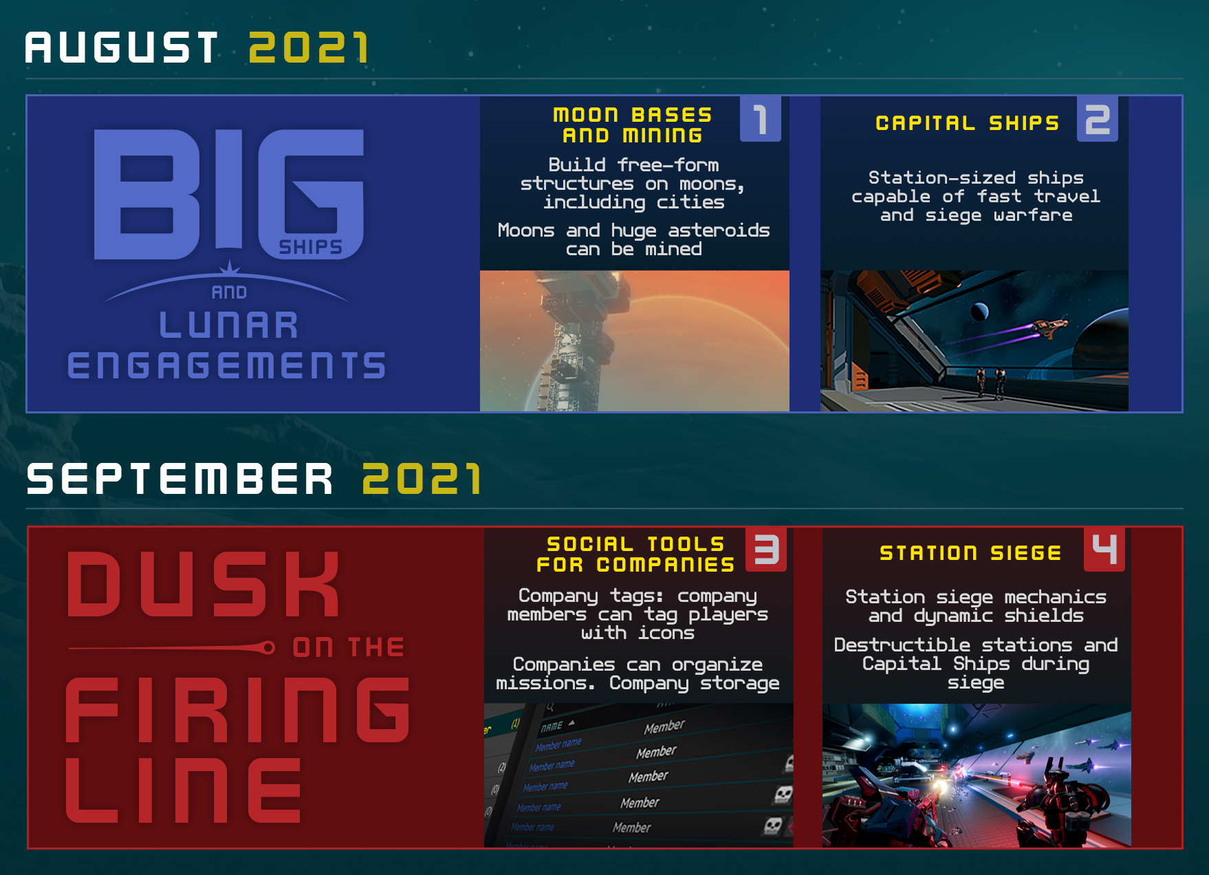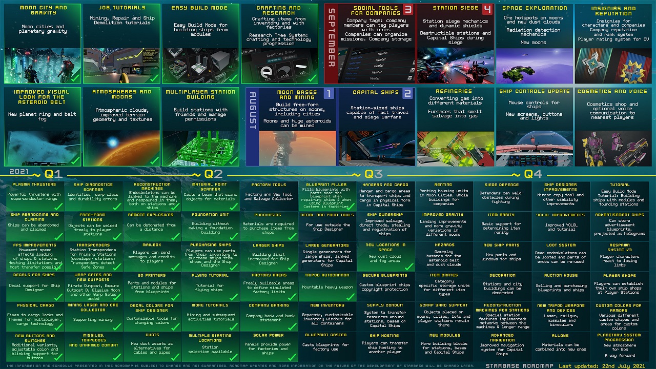 Après un premier report, Starbase confirme : la simulation spatiale sortira bien le 29 juillet prochain en accès anticipé pour la modique somme de 32,99€ sur Steam. Ils profitent de l’annoncer pour présenter les deux premières mises à jour majeures qui sortiront respectivement au mois d’août et septembre (voir image ci-dessous). La première apportera des bases lunaires et les vaisseaux amiraux. La seconde des outils pour gérer sa compagnie et les sièges de stations spatiales. Une feuille de route très complète est aussi visible ci-dessous ou disponible à cette adresse.