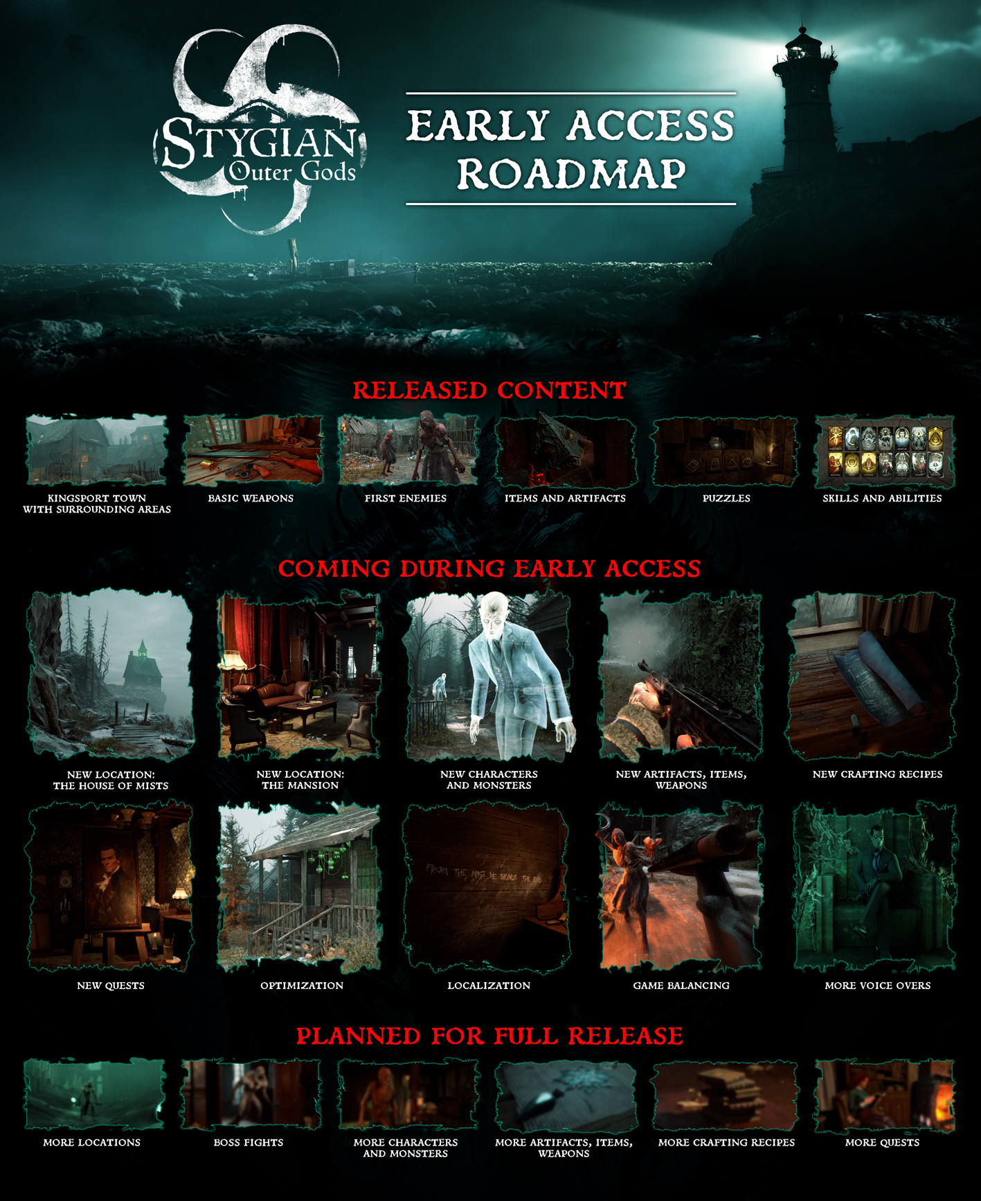 Pour rassurer les fans de l’imaginaire de H.P. Lovecraft, les devs viennent de publier leur roadmap. On découvre qu’il y aura, avant la release, deux nouveaux lieux incluant des personnages intrigants et de nouveaux ennemis. Plusieurs quêtes seront également ajoutées ainsi que des recettes d’artisanat, des consommables et des armes feront aussi leurs apparitions. Ils annoncent par ailleurs qu’une prochaine mise à jour arrivera améliorant l’équilibrage, les performances et l’optimisation, sans oublier la correction de moult bugs et crashs qui rendent actuellement l’expérience parfois agaçante.