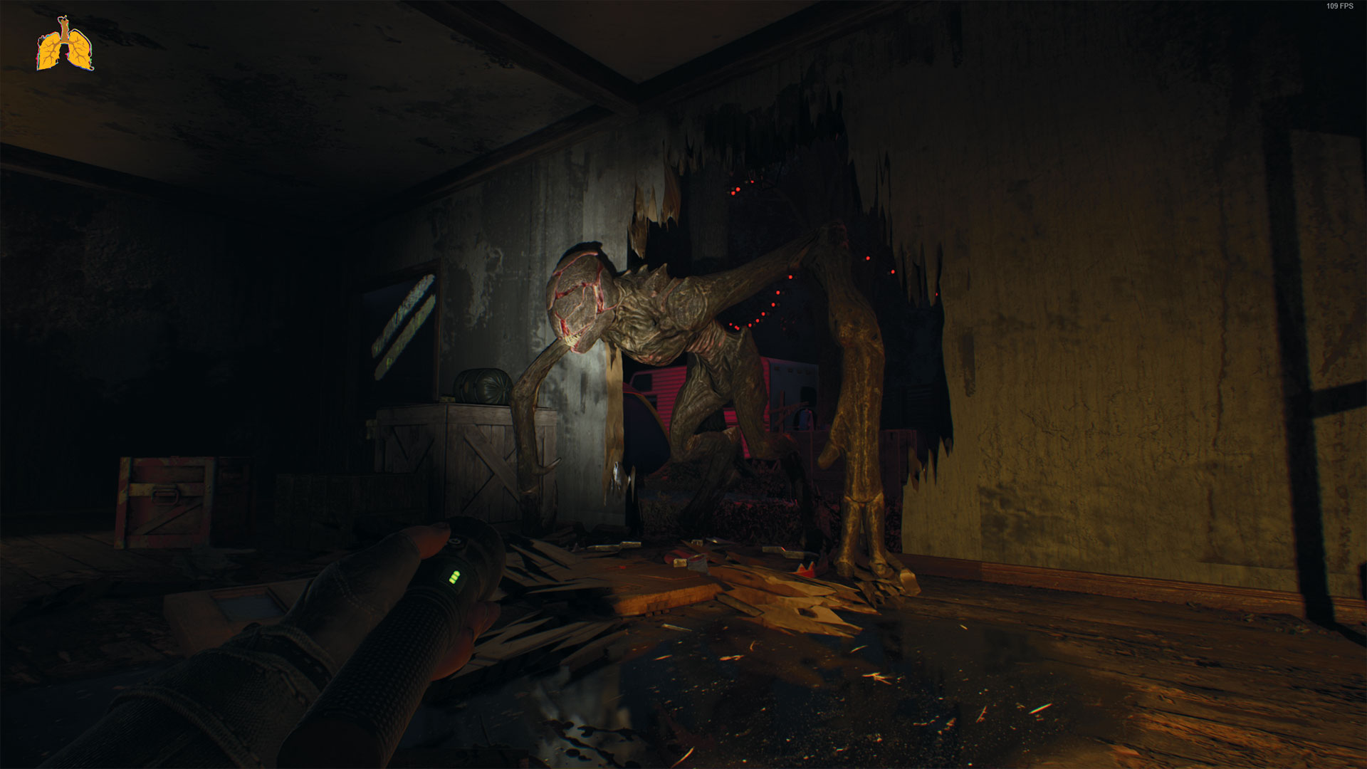 Le système de détection sonore prend en compte le volume, la durée et la quantité de bruits. En fonction du niveau de difficulté que vous avez sélectionné, faire un bruit fort ne provoquera pas immédiatement votre mort, mais en produire trop déclenchera obligatoirement une animation, comme dans Alien: Isolation. Sur votre écran, une icône de poumon vous indiquera « l’état d’asthme » de votre personnage. La gestion de celui-ci ajoute un peu de tension, mais cela reste une mécanique de survie basique. Les crises d’asthme surviennent si vous forcez trop, si vous approchez des créatures ou si vous évoluez dans des environnements poussiéreux. Les battements de cœur et quelques indicateurs visuels vous préviennent, mais rien de bien surprenant. Pour y remédier, vous devrez soit avaler des pilules, soit utiliser des inhalateurs. Planqués un peu partout, ils deviennent vite essentiels dans les niveaux avancés. Lors d’une crise, des QTE vous permettront de limiter les dégâts. Cette mécanique impose un peu plus de prudence et d’attention, mais sans révolutionner le genre.