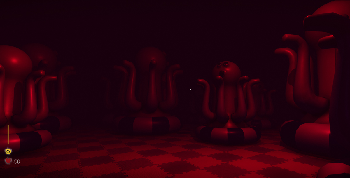 Une fois descendu au rez-de-chaussée, alors que vous vous attendiez à voir vos parents, vous vous retrouvez finalement tout seul. Enfin presque : votre principale préoccupation sera dorénavant Red Belly, l’unique menace qui vous poursuivra tout au long du jeu pour vous mettre en pièces. Rassurez-vous, le monstre est aussi lent qu’un nonagénaire en déambulateur. Vous aurez toujours le temps de vous cacher sous une table ou dans les nombreux casiers disséminés un peu partout sur la map. La particularité de ces derniers, c’est que vous ne pouvez pas entrouvrir la porte ni voir entre les grilles. Vous devrez donc patienter gentiment que l’ennemi s’éloigne doucement. Une fois la partie de cache-cache terminée, vous pourrez chevaucher votre tricycle et ainsi fuir les lieux.