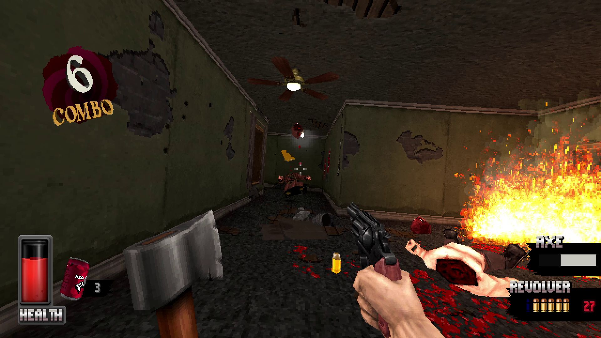 Comme dans Mullet Mad Jack, progresser dans un niveau est une course contre la montre. Si, cette fois, on n’a pas la contrainte des dix secondes à vivre, les appartements que l’on parcourt sont lentement consumés par les flammes qui nous poussent constamment vers l’avant. Et, ici encore, l’important est moins d’aller vite que de trouver un rythme entre glissades, headshots, coups au corps-à-corps, et ramassage de canettes de soda. Une fois qu’on a pris nos marques, on arrive à un gameplay très fluide et plaisant qui récompense vitesse et précision d’exécution.
