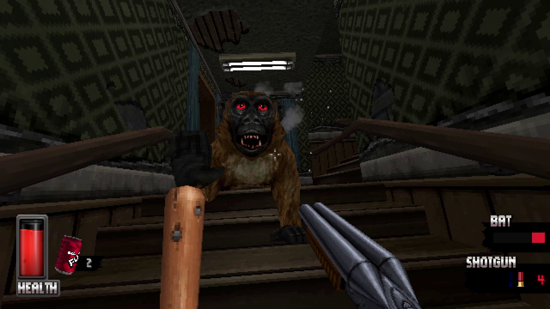 L’aspect rogue-lite du jeu est assez léger et consiste à acheter une amélioration entre chaque niveau grâce aux canettes de soda qu’on ramasse dans les couloirs, et qui servent aussi à nous soigner : plus grande barre vie, rechargements plus rapides, capacité de se soigner en faisant des squats sur place (oui oui) ou, un peu mois utile, avoir une poêle à frire en guise d’armure lorsqu’on jette un ennemi par une fenêtre. Contrairement à d’autres jeux du genre, il n’y a ici aucune progression en dehors d’une run, puisqu’on ne conserve pas ses upgrades, et on ne débloque pas de nouvelles armes en jouant. Les même types d’ennemis et d’obstacles apparaissent toujours aux mêmes niveaux, tout comme les armes qu’on ramasse. On en vient ainsi au plus gros point noir du titre : la répétitivité.