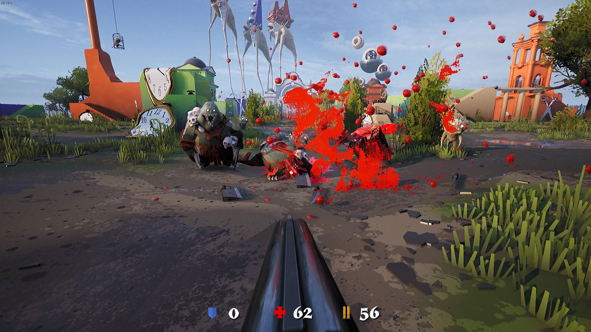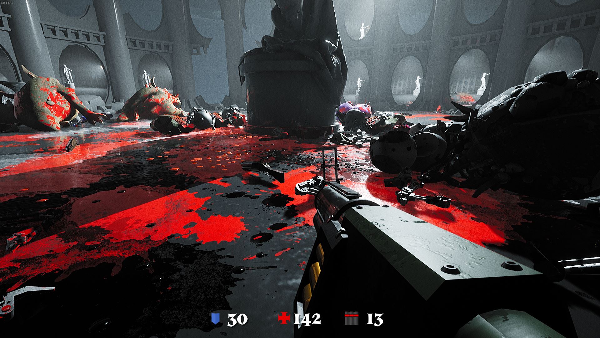 Rien de bien original, me direz-vous, mais peu importe, car le feeling est vraiment très plaisant. D’une part, les déplacements sont dynamiques, la caméra se penchant légèrement lors des strafes, avec des mouvements rapides et un double saut. Et d’autre part, les armes ont une sacrée patate et ça fait bien plaisir ! Que ce soit au niveau du sound design ou graphiquement avec les explosions de gore et les démembrements, on est encouragés à massacrer les monstres dans une jouissance extatique. Il n’y a clairement pas besoin de plus pour faire un bon jeu !
