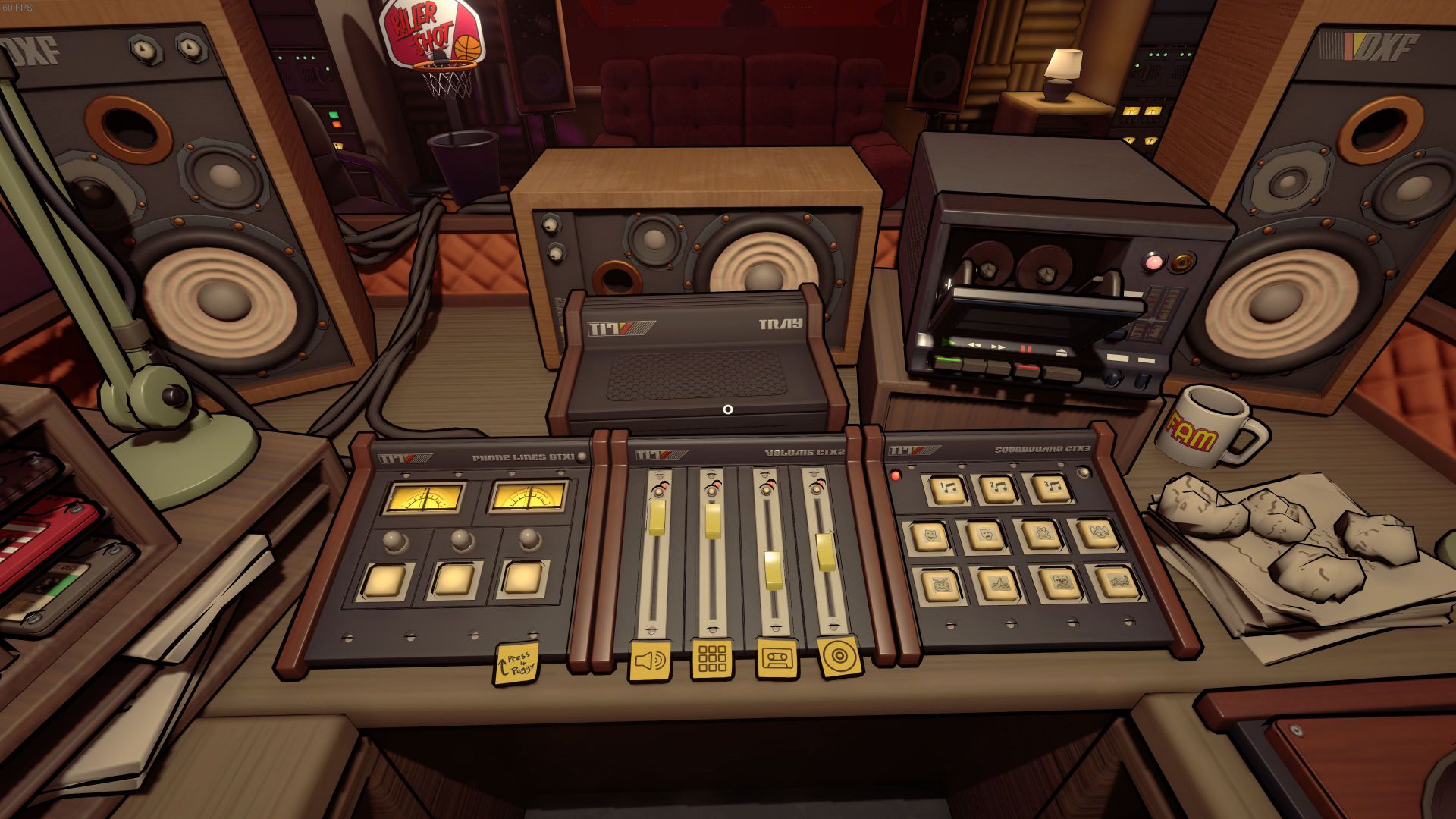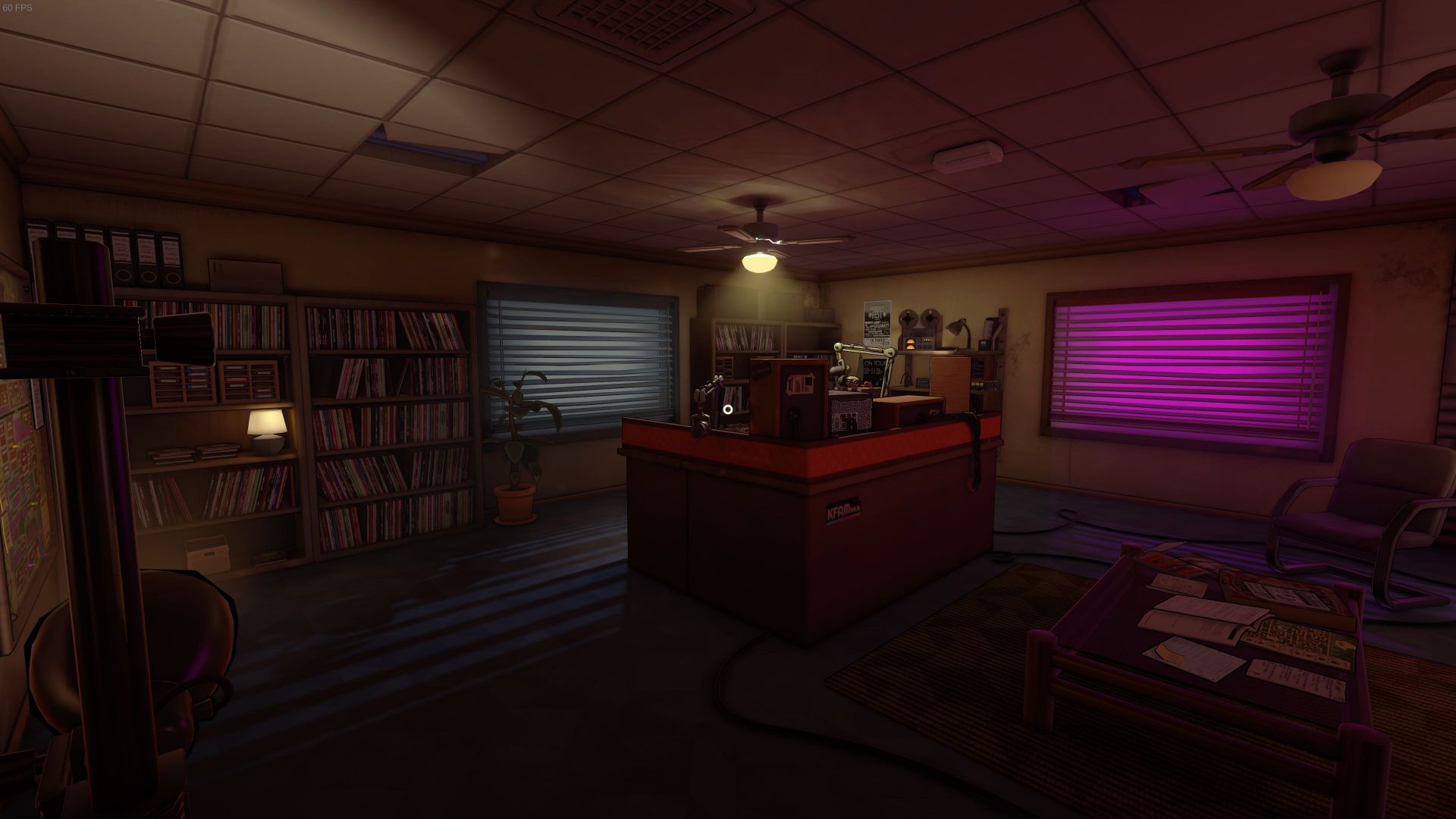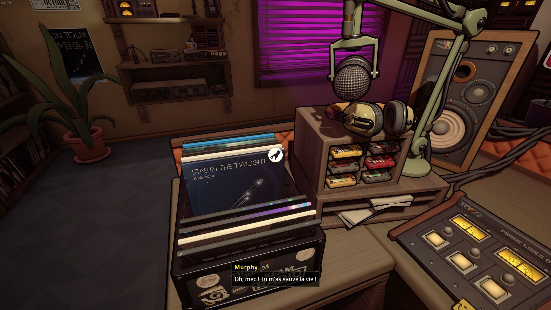 Graphiquement, Killer Frequency est plutôt chouette. Il n’affiche rien de fou, mais la direction artistique aux accents de néons fonctionne très bien avec le cell shading. Sans surprise, il tourne sans aucun problème sur n’importe quelle machine, et de toute façon, vous n’auriez que 30 pauvres FPS qu’il serait tout de même jouable. La partie sonore a bénéficié d’un très bon travail, avec des effets très crédibles pour les communications téléphoniques, l’interphone ou les enregistrements sur cassette. La musique, que l’on peut choisir en plaçant l’un des vinyles sur la platine, est également de très bonne facture, et propose plusieurs genres différents. Elles ont d’ailleurs toutes été créées pour l’occasion, ce qui est notable. Vous pouvez même les retrouver sur YouTube, si vous appréciez. Tous les dialogues sont doublés en anglais, et là aussi, les acteurs ont fait du bon travail. Et il n’y a quasiment rien à dire sur les sous-titres en français, la traduction est globalement très bien faite.