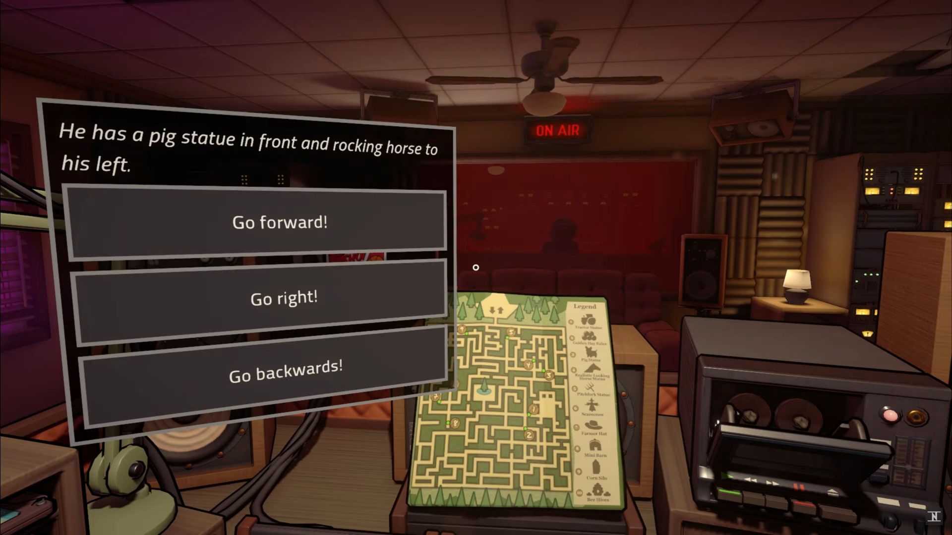 Alors qu’il était le DJ d’une radio d’une grande ville des États-Unis, Forrest Nash, le héros que l’on incarne, est exilé dans la petite bourgade de Gallows Creek, pour devenir animateur de la radio locale. Mais cette soirée de septembre 1987 ne va pas se passer comme prévu : un serial killer, que tout le monde pensait mort, refait surface, tue le shérif et coupe les communications téléphoniques avec les autres villes. La seule policière restante doit donc aller chercher des renforts, situés à des heures de route, vous confiant le standard de la police. C’est le point de départ d’une longue nuit pendant laquelle vous devrez mettre des disques, discuter avec votre collègue cachée derrière une vitre teintée, et surtout, tenter de sauver les gens qui vont vous appeler. Et pour cela, il n’y aura pas 36 solutions : vous devrez fouiller dans les locaux de la radio locale, qui, comme par hasard, recèlera à chaque fois, le guide pour la solution au problème. Une femme poursuivie a perdu ses clefs de voiture ? Vous avez un article qui décrit toute la procédure pour braquer une caisse. Un jeune homme est perdu dans le labyrinthe de maïs de la ville ? Vous aurez le plan détaillé, etc. Ce ne serait pas forcément un problème si les « énigmes » étaient un peu plus corsées, et ne provenaient pas d’un cahier de vacances CP/CE1…