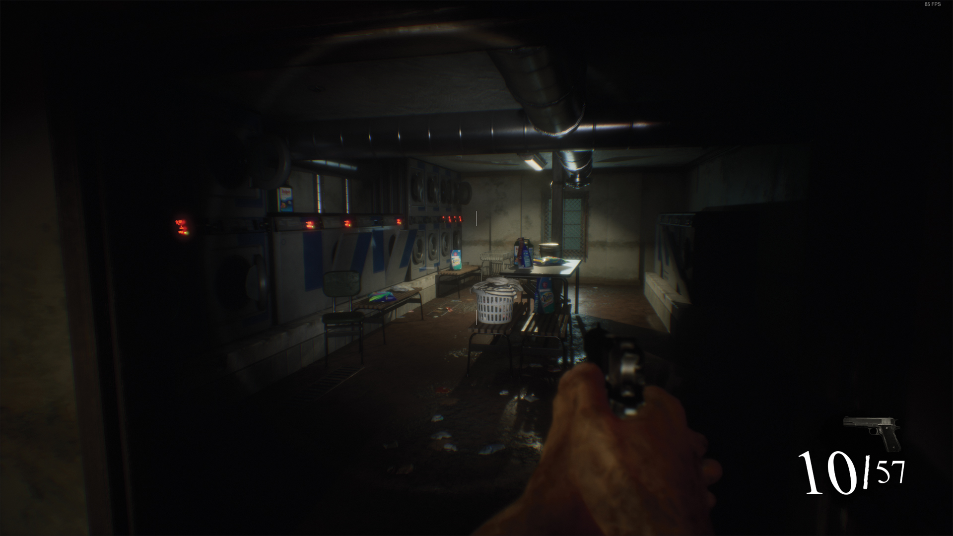 Dans Pneumata, un soin particulier a été apporté à la direction artistique. L’ambiance horrifique est, en général, bien retranscrite. Cependant, le fait d’être constamment plongé dans l’obscurité est un bon moyen de masquer de nombreuses faiblesses. Grâce à la lampe, j’ai pu admirer de belles scènes d’horreur, mais aussi constater de nombreux problèmes de texture. Certains objets étaient complètement dégueulasses. Il en va de même pour les ennemis du jeu. Outre le fait qu’ils soient vraiment très cons, les textures sont grossières — probablement à cause des assets UE achetés sur le store. Les armes, quant à elles, sont plutôt réussies et le feeling n’est pas si mal. On a vu bien pire, mais aussi beaucoup mieux. Concernant l’IA, j’ai eu beaucoup de mal à comprendre comment la hitbox fonctionnait. Sur un même type d’ennemi, j’ai parfois dû tirer quatres cartouches de fusil dans le buffet pour en venir à bout, alors que pour d’autres, quelques balles de 9 mm suffisaient. À ce niveau-là, c’est complètement à la ramasse, sans compter les boss, qui sont de véritables sacs à PV.