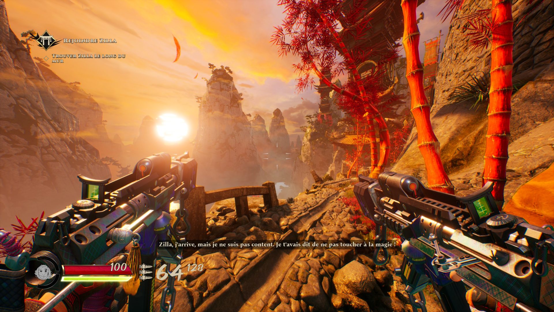 Un gigantesque dragon ancestral, libéré lors de l’aventure précédente, ravage la planète tout en donnant naissance à une armée de Yokaïs, des démons d’inspiration japonaise. Le dernier espoir de l’humanité est Lo Wang, un ex-ninja aussi talentueux qu’immature et, il faut bien l’avouer, idiot. Associé à un ancien ennemi, notre héros devra accomplir divers rituels magiques incompréhensibles afin de se débarrasser du méchant dragon et des milliers de démons infestant désormais le monde. On ne va pas se le cacher, le scénario de Shadow Warrior 3, volontairement parodique et nanardesque, n’est pas intéressant pour un sou. En réalité, il ne sert que de prétexte pour le déluge de blagues potaches qui parsèment l’aventure de bout en bout, de façon similaire à ce qu’on pourrait trouver dans un Borderlands. Et ce n’est pas vraiment une qualité : si certaines références font mouches et peuvent déclencher un léger sourire amusé, il s’agit la plupart du temps de blagues sur le caca, sur les zizis, et tout autre sujet qui font rires les enfants – ou les piliers de bar après 23 heures. S’il est vrai que la saga n’est pas réputée pour son écriture, Shadow Warrior 3 pousse les potards plus loin en nous bassinant de lignes de dialogues tout droit tirées d’un spectacle de Bigard pendant toute l’aventure. Bon, il en faut pour tous les goûts après tout… En plus, les gens du studio Flying Wild Hog semblent très fiers de leur scénario et infligent au joueur de nombreuses cinématiques intrusives, moches et qui tournent à 20 FPS.