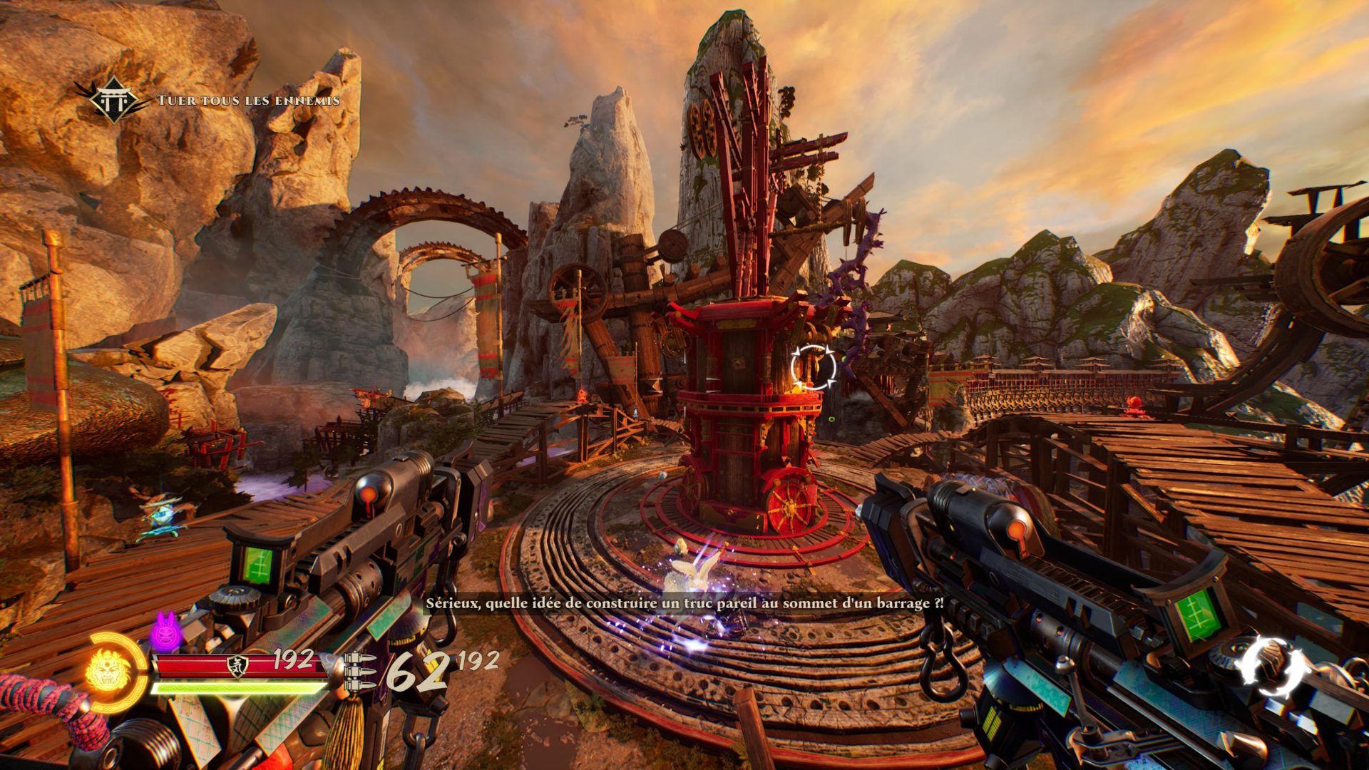 Toutefois, l’histoire loufoque permet aux développeurs de se lâcher sur l’univers. Celui-ci est particulièrement original, dépeignant un monde mélangeant futurisme, environnements naturels asiatiques, mécanismes antiques et magie étrange. Des colonnes de pierre ornées de pagodes emplissent l’horizon, tandis que d’anciennes machineries exotiques côtoient des canons lasers géants. Évidemment, il n’y a pas la moindre cohérence et les lois de la physique sont souvent maltraitées, mais peu importe : l’ensemble est à la fois très original et magnifique pour un projet de cette envergure, notamment grâce à une direction artistique de haute volée. D’ailleurs, cela ne s’arrête pas aux environnements ou aux divers panoramas que l’on a l’occasion d’admirer, car cette folie douce se retrouve également dans l’arsenal (fusil à pompe, mitrailleuses, mais aussi lance-scies et railgun ancestral…) et les ennemis, à l’apparence variée et librement inspirés par les légendes japonaises. On y retrouve pêle-mêle des samouraïs à quatre bras, des taupes-foreuses, des marionnettes de glace ou de gros Oni armés de marteaux. Certains seront refroidis à l’idée d’affronter des accordéons géants tirant des feux d’artifice, mais on ne peut pas nier que cela change fondamentalement des habituels démons/zombies/forces de l’axe du mal. En somme, l’aspect artistique du jeu est extrêmement travaillé, arrivant à proposer des visuels originaux et chatoyants, pétaradant de couleurs et d’effets spéciaux dans tous les sens. Peut-être même un peu trop pour son propre bien…