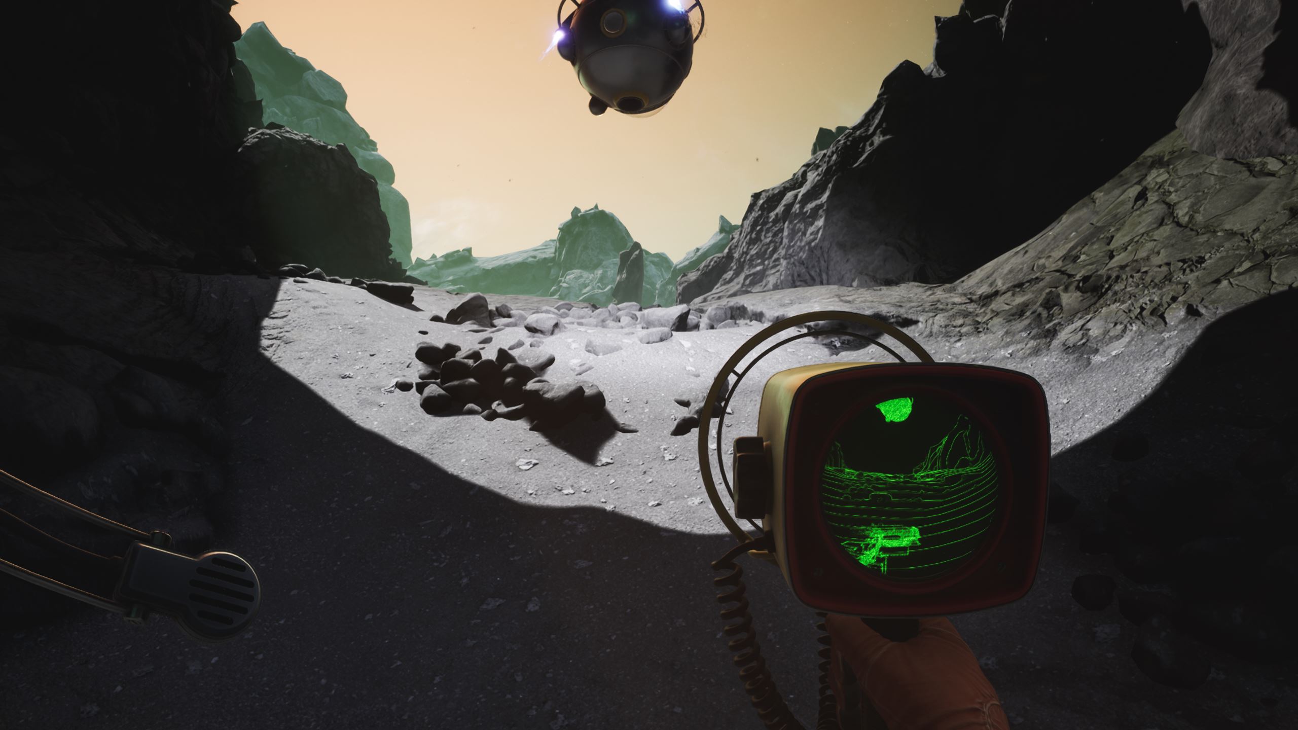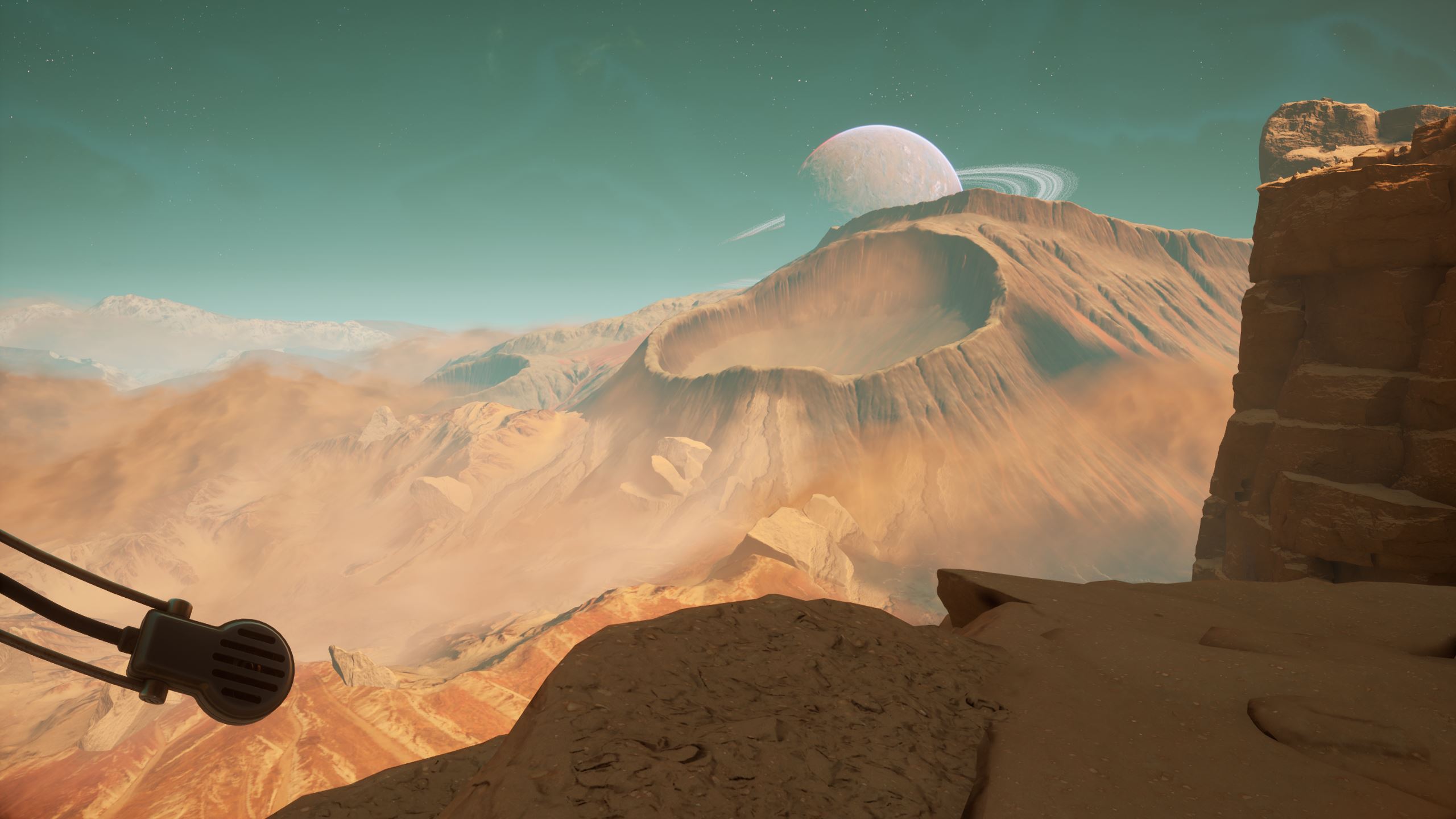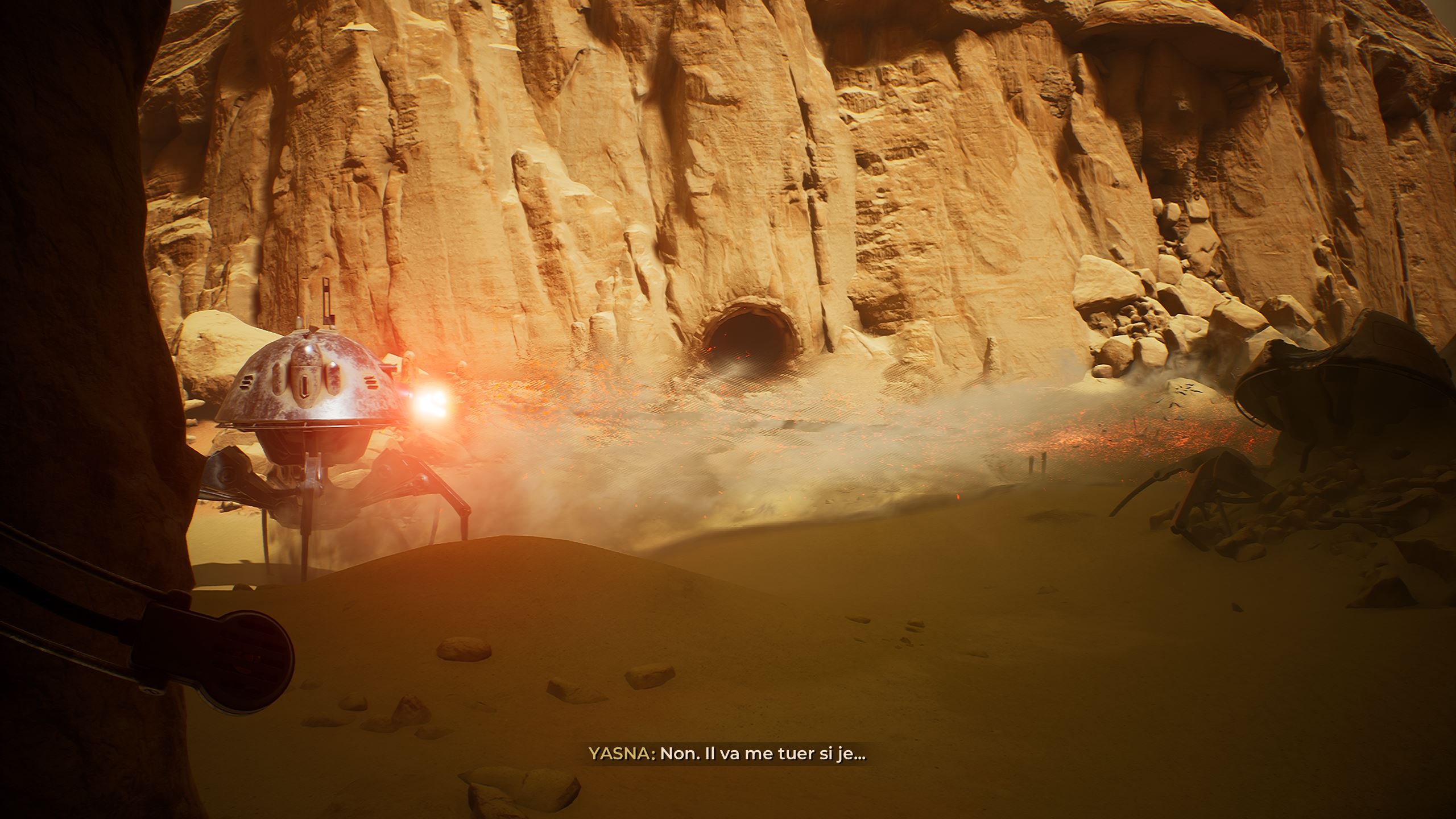 Vous l’avez déjà sans doute remarqué, The Invincible est beau. Très beau. Tout d’abord, il y a les paysages, parfois à couper de souffle, de Regis III. On alterne entre canyons étroits et zones ouvertes, voire des étendues à perte de vue. La direction artistique est une très grande réussite, et comme pour Scorn, dans un autre registre, je me suis arrêté à plusieurs reprises, afin de contempler la scène proposée par les développeurs. Les équipements, véhicules et différents modules humains, avec leur design rétrofuturiste des années soixante, sont également très bien réalisés et tout à fait cohérents avec l’univers du jeu. La musique est aussi de bonne facture. Toujours discrète, très atmosphérique, elle est même parfois absente, laissant uniquement le bruit des pas et du vent accompagner le joueur. Côté technique, c’est presque un sans-faute, car les performances sont excellentes – même s’il n’y a pas tant de choses à afficher que ça. Par exemple, sur mon PC portable doté d’un Core i5 12500H, de 32 Go de RAM et d’une RTX3060, il tournait en 1440p tout à fond, DLSS qualité à 60 FPS constants. J’ai juste rencontré quelques petits bugs de textures qui ne se chargeaient pas correctement et restaient pixelisées, mais qui ont été corrigés quelques jours après la sortie.