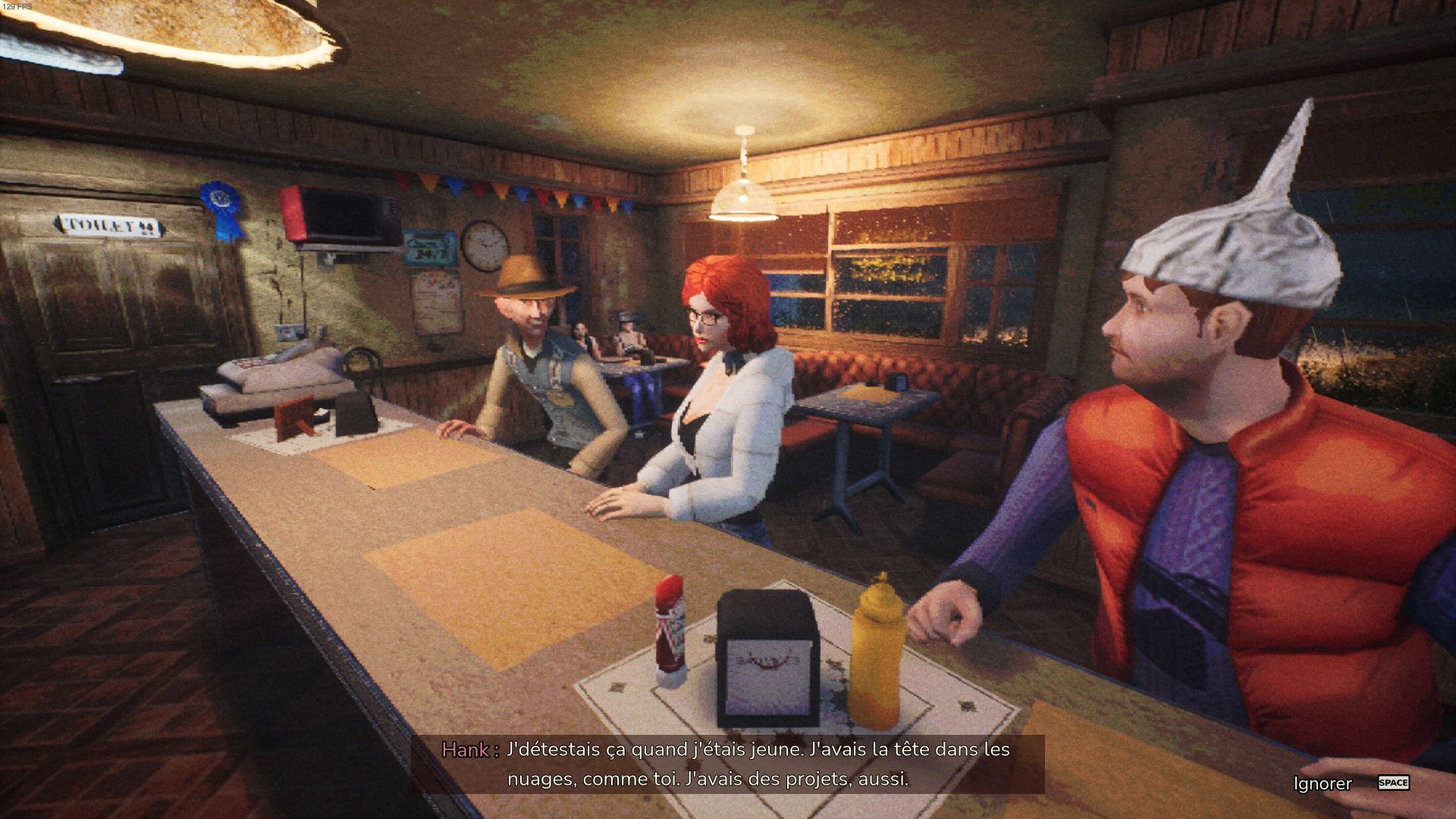 Autant le dire tout de suite, la narration est au centre de While We Wait Here. À de nombreuses reprises, vous perdrez la main sur le personnage, et vous devrez attendre la fin des dialogues. Cela pourrait paraître comme un défaut, mais ce ne l’est finalement pas tant que ça, si l’on parvient à se plonger dans l’histoire, que j’ai trouvé plutôt prenante et bien construite. Sans trop dévoiler l’intrigue, on incarne l’un ou l’autre des membres d’un couple qui possède un petit restaurant paumé au milieu de la pampa américaine, et qui va traverser un drame. Loin d’être totalement explicite, le jeu fait passer le message par des métaphores, et notamment une ambiance de fin du monde et des passages lorgnant sur l’horreur psychologique. Mais tout au long de l’aventure, on discutera également avec plusieurs personnages – les clients –, qui nous raconteront leurs soucis avec un doublage anglais impeccable. Les développeurs indiquent sur la page Steam qu’on peut les aider, et que cela influe sur la narration. Vous ne pourrez pas rater ces moments, puisqu’ils se traduisent par un choix de dialogue, et qu’ils sont assez rares. Si cela permet théoriquement une certaine rejouabilité, je dois admettre qu’après avoir relancé pour tester une autre branche de l’histoire, je n’ai pas trouvé assez de différences pour justifier une nouvelle partie – du moins, pas immédiatement. J’aurais plutôt préféré une aventure plus linéaire, mais plus longue, ce qui m’aurait permis de profiter de la direction artistique un peu plus longtemps. Les gros pixels façon PSOne – en tout de même beaucoup plus fins – et les effets visuels, collent parfaitement à l’ambiance mêlant détresse, dépression et nostalgie.