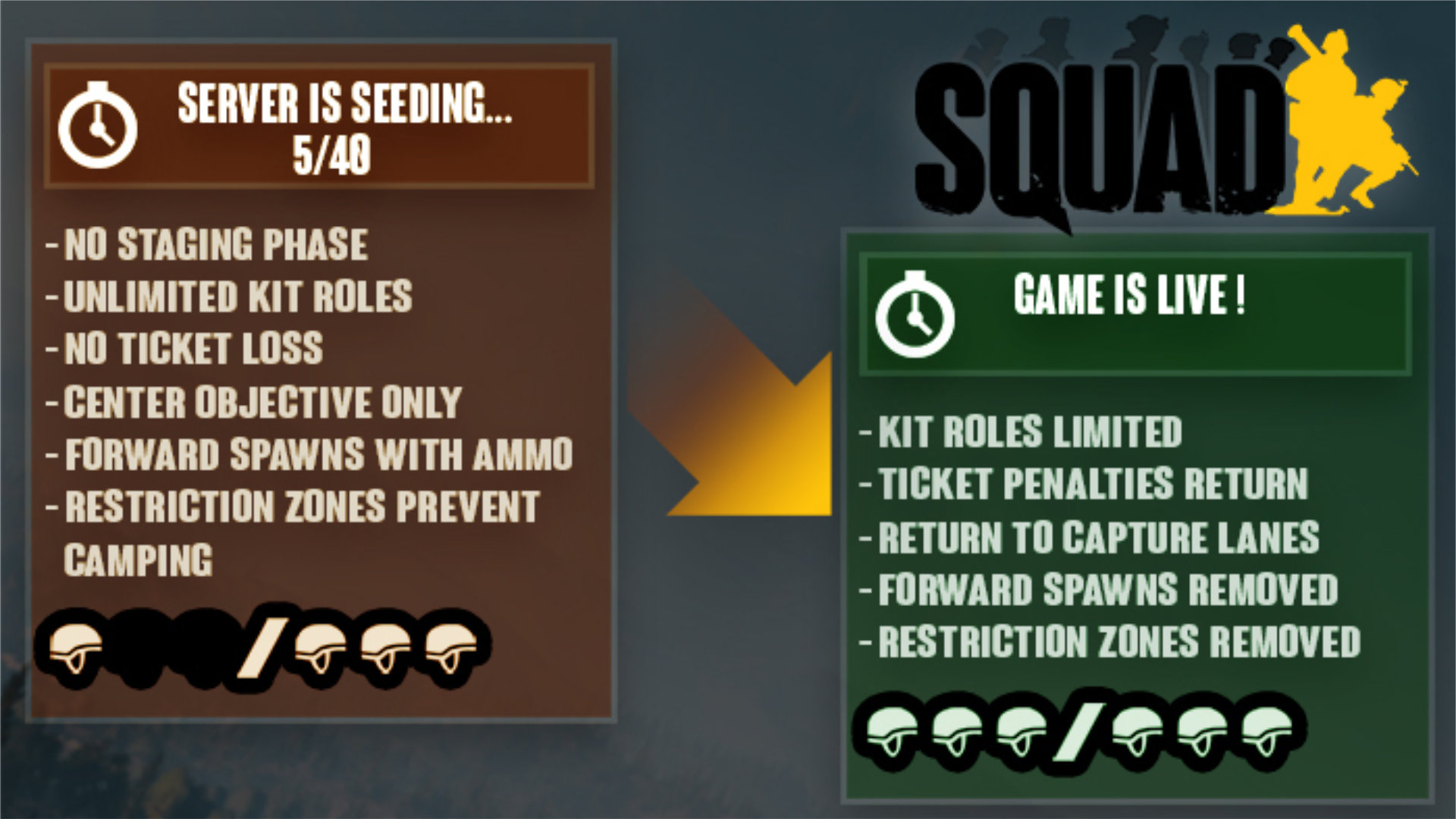 Un peu plus d’un mois après l’arrivée des australiens, Squad recevra de nouveau du contenu demain, à l’occasion de son passage en version 2.16. L’armée Canadienne recevra trois variantes de l’APC M113A3, quatre modèles de la jeep LUVW et un hélicoptère de transport CH-178. Les insurgées recevront quant à eux un « Hell Canon« , a priori, une sorte de mortier Wish, permettant de propulser des bonbonnes de propane dans les rangs adverses. Enfin, la dernière grosse nouveauté de cette mise à jour, c’est la refonte du mode de jeu de seed. Les nouvelles règles de ce dernier sont résumées dans l’image ci-dessous.