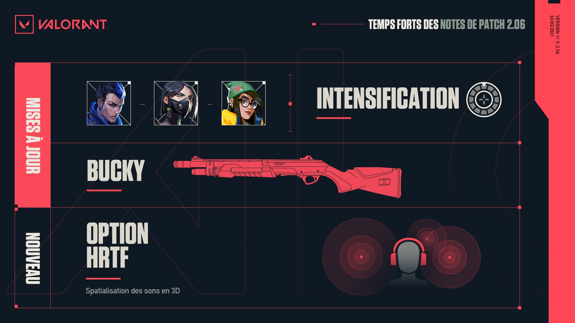 Valorant vient de déployer sa mise à jour 2.06. Comme d’habitude, de nombreux équilibrages sont apportés aux opérateurs. Aujourd’hui, c’est Viper, Yoru et Killjoy qui reçoivent des modifications dont le détail est visible à cette adresse. Côté armes, le Bucky reçoit des changements avec une dispersion moins importante et des dégâts réduits pour son tir alternatif. Pareil, le détail est ici. Le gros morceau du patch concerne la spatialisation 3D des sons avec le support du HRTF. Vous pouvez voir la différence sur la vidéo ci-dessous. Notez que pour l’instant uniquement les bruits de pas, les rechargements et les réapparitions du mode DM sont spatialisés.
