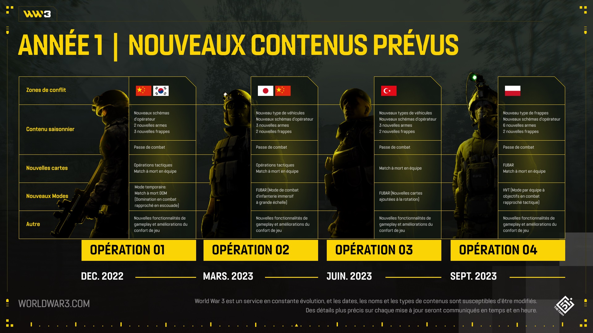 World War 3 vient de publier sa feuille de route pour les mois à venir. Au total, 4 mises à jour majeures sont prévues. La première arrivera dès le mois de décembre prochain. Globalement, chaque « opération » apportera des véhicules, des armes, des cartes, des modes de jeu et diverses améliorations techniques. Chaque saison sera aussi synonyme d’un passe de combat. Après tout, le jeu est free-to-play, il faut bien le rentabiliser. Tout cela est résumé sur l’image ci-dessous.